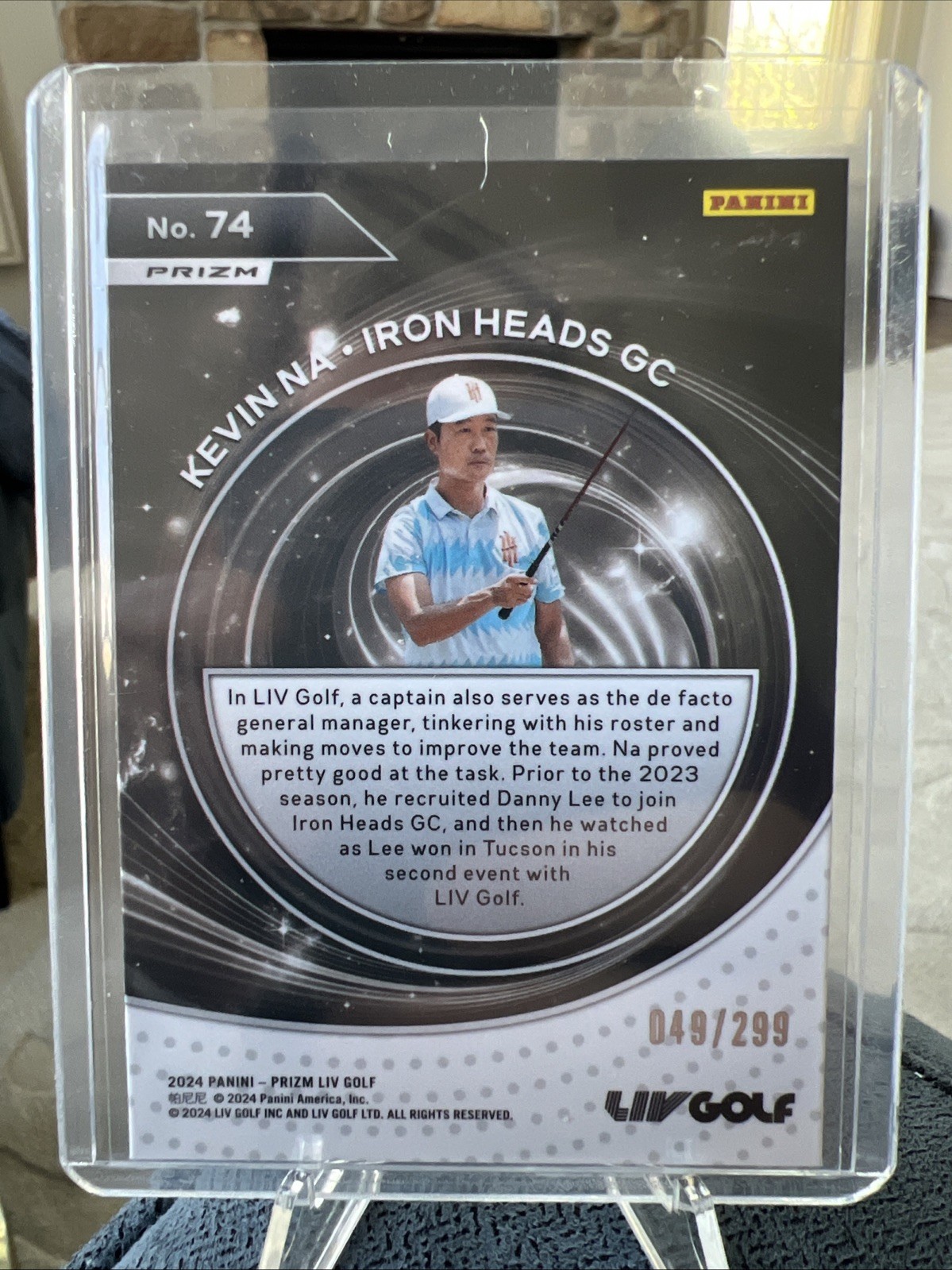 The product is a 2024 Panini Prizm Liv Golf Captains Pulsar trading card featuring golfer Kevin Na. The card is an original licensed reprint from the Panini manufacturer, with a serial number of /299. It is a part of the golf franchise and is not autographed. This collectible item measures 3½" x 2½" and falls under the category of Sports Trading Cards in the Sports Mem, Cards & Fan Shop section.