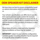 HookedOnTronicsBuys 46CSS684+F253545559916SH OEM Speaker Replacement Kit CS Series Front/Door Factory Speaker Replacement Kit with Speaker Harness for Ford F-250, F-350, F-450, F-550 1999-2016 (price is per pair) BRAND in ORIGINAL BOX Authorized Online KICKER Dealer KICKER proudly offers its products through a carefully selected Authorized Dealer network. If you do not see the official KICKER Authorized Dealer seal, then it is not an Authorized Dealer. Only products purchased from a KICKER Authorized Dealer qualify for the manufacturer's warranty and are backed by years of outstanding customer service through our Authorized Dealer network. Kicker 46CSS684 6"x8" CS Series Front/Door Factory Speaker Replacement Kit with Speaker Harness for Ford F-250/F-350/F-450/F-550 1999-2016 Bundle of 2 Items: Kicker 46CSS684 6"x8" CS Series Car Component Speaker System (Pair) Vixen Go VGH-72-5600 Speaker Harness (Pair) 6"x8" CS Series Car Component Speaker System (Pair) Peak: 225 watts RMS: 75 watts Impedance: 4 Ohms Sensitivity: 90 dB Frecuency Response: 40-21,000 Hz 12dB crossovers with a smaller footprint for easier installation Three-position tweeter switch for dialing in your highs EVC™ (Extended Voice Coil) technology help deliver remarkable bass response Titanium tweeter construction and neodymium magnets to reveal subtle details UV-treated poly-foam surround assists with precise linear excursion Phase plugs in the woofer cones eliminate any distortion Steel mesh grilles protect your drivers Three tweeter mounting options including flush, angled and surface pods Speaker Harness (Pair) Connects Aftermarket Speakers to the Factory Speaker Harness Quick and Easy Installation No Cutting Needed Plugs Directly Into Vehicle's Speaker Connector All Kicker Products, can only be shipped within the United States of America. General Type Component System Design 2-way Tweeter Design Dome Tweeter Composition Titanium Specifications Sensitivity 90dB Frequency Response 40 - 21,000Hz RMS Power Range 75 Watts Peak Power Handling 225 Watts Impedance 4Ohms Dimensions Woofer Size 6 x 8" Top-mount Depth 2-3/16" Tweeter Size ¾" WARRANTY HookedOnTronics warrants that your new purchased item is free from defects and will function to its full specifications under normal use for a period of 1 year from the original invoice shipping date. SHIPPING & IMPORTANT INFORMATION A signature may be required at our discretion. If your shipping address is a PO box, you must select USPS as your shipping option, or provide a physical address. For all other addresses, we will select the shipping carrier of our choice. AK/HI/PR and other US Protectorates - Free shipping does not apply to these locations. You must select USPS or air shipping as your option at checkout. APO/FPO addresses - We are unable to ship to APO, FPO or other military addresses. Non-USA buyers - Shipping charges do not include any import fees to non-US addresses. These charges are normally collected by the delivering freight (shipping) company or when you pick the item up - do not confuse them for additional shipping charges. We do not mark merchandise values below value or mark items as "gifts" - US and International government regulations prohibit such behavior. The following brands can only be shipped within the USA: Kicker. Copyright © 2000-2024 HookedOnTronicsBuys. All Rights Reserved.