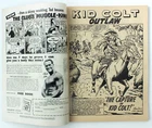I Will Always Combine Postage, UK only. Read My Descriptions, See my Feedback, View My Photos, Visit My Other Listings All Silver/Bronze age comics are posted in comics bags with backing boards inside rigid envelopes All photographs are of the item you are bidding on. I do not use stock shots. See below for original American publication details and creator credits. Kid Colt 49 uk Published by Strato Publications (Thorpe & Porter) in 1961. 68 Page Black & White UK comic which reprints silver age Marvel/Atlas and DC Comics western strips. Cover by Jack Kirby originally from Kid Colt Outlaw 83 Published March 1959. A great compilation featuring some of the great early silver age creators including a Jack Kirby cover, Stan Lee, Jack Keller, Joe Maneely, Joe Sinnott, Gil Kane, Gardner Fox, Mark L Pakula, Doug Wildey and Carmine Infantino. For your 1961 1/- you got a reprint of Marvel/Atlas Kid Colt Oulaw 83 from March 1959, a strip each from Atlas’s 1955 Outlaw Kid 3 & 5 and 3 strips from DC Comics 1959 Western Comics 73. Original Cover Price 1/- Condition Very Fine Covers. This is a flat perfect bound book which means pages are glued to the spine rather than stapled. Cover is firmly attached to pages with very minor stress. Minor spine, edge and corner wear. Back cover has a feint 5cm corner crease. Front cover colour is bright, clean and reflective little dimmed by its 65 years. Back cover is clean and white Inside covers are white and clean with very minor margin tanning.. Inside. All pages are firmly attached to spine without stress. They are cream and unblemished. Lovely condition. The following are all reprinted from Kid Colt Oulaw 83. Published by Atlas/Marvel in March 1959. The Capture of Kid Colt!, script by Stan Lee, pencils by Jack Keller, inks by Chris Rule; Kid Colt gives himself up to help a good sheriff get re-elected. Ranch Hand's Luck text story, art by Joe Maneely. Midnight Hawkins, Gunman!, script by Stan Lee, pencils by Jack Keller, inks by Chris Rule; Kid Colt stops a gang from robbing an old man. No Place To Hide!, art by Joe Sinnott ; Three crooks try to frame an innocent man for a murder they committed, but their scheme is exposed when the victim turns out to have survived. Stagecoach To San Antoine!, script by Stan Lee, pencils by Jack Keller, inks by Chris Rule; Kid Colt catches a ride on a stagecoach, and the passengers learn a lesson about rushing to judgement when he stops a respectable-looking passenger from robbing them. The following are reprinted from Western Comics 73 published in February 1959 by DC Comics. The Return of the Fadeaway Outlaw starring Pow Wow Smith, script by Gardner Fox, art by Carmine Infantino. Nighthawk's Tricky Dilemma, script by Gardner Fox, pencils by Gil Kane, inks by Bernard Sachs. The Riddle Robber starring the Wyoming Kid, script by Gardner Fox, art by Howard Sherman. The following is reprinted from Outlaw Kid 5 published in May 1955 by Atlas. "The Flames of Violence," art by Doug Wildey ; The Outlaw Kid is helping the sheriff of Caliber City keep a lynch mob away from Larkin a man who robbed a coach and is accused of murdering the driver, telling the mob that Larkin deserves the right to a fair trial; After quietly telling the sheriff to sneak Larkin out the back door, the Kid is assisted by a man named Mason who appears to believe that Larkin deserves a fair trial as well and the mob disburses. …..And from 1955’s Outlaw Kid 3 - The Fence a short drawn by Mac L Pakula a moody artist normally associated with silver age war comics, undervalued I think. Active throughout the 1950s and 1960s, Thorpe & Porter was a distributor of American comics in the UK, and also published a number of original titles mostly using reprinted American material from various publishers, including the misadventures of Laurel & Hardy. They are also notable for having published The Avengers, a 68 page one-off title based on the cult TV show in 1966, as well as repackaging unsold copies of American titles as Double Double Comics. From 1959, they also published the British editions of Mad Magazine and Classics Illustrated. They were eventually bought by the distribution arm of America's DC Comics, one of the companies which they had formerly handled UK distribution for. Top Sellers (publishers of Super DC, Miracle Man, Psycho and Nightmare) and Strato Comics were also originally imprints of Thorpe & Porter (Top Sellers was active well into the 1970s). They also published Superboy Annuals in conjunction with Atlas Publishing & Distributing Ltd. All comics are from my own collection which I am disposing of. All photographs are of the comic you are bidding on. I do not use stock shots. I try to create short sets - usually with 6 or less related issues – to provide the reader with a complete or near complete story arc or theme. This provides a better reading experience and can also encourage a jump in point for new companies, characters or titles. I aim for honest grading and will always describe any shortcomings including the presence of price stickers. All are packed securely. I identify “my favourites” as such. This doesn’t necessarily mean that they are better than my other listings - although I guess I would argue that they are!! You judge. I will always combine postage costs for multiple purchases. Hope you enjoy reading them as much as I have collecting them.