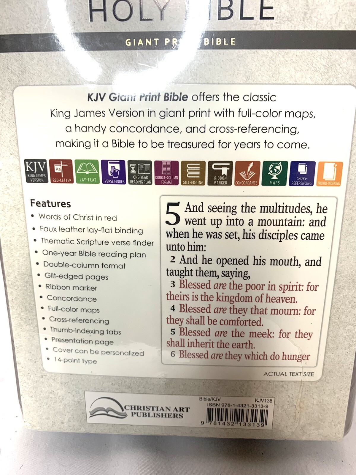 Bargainbookstores KJV Bible Giant Print Brown (Leather / Fine Binding) By Condition: Format: Leather / Fine Binding Publisher: Christian Art Gifts Inc Publication Date: 8/9/2020 ISBN: 9781432133139 About Us Payment Shipping Terms Returns Welcome to BargainBookStores Your source for quality books at reduced prices. Satisfaction guaranteed! We guarantee your satisfaction and stand behind everything we sell. Standard shipping is always free to the lower 48 states. Expedited and International shipping options are also available. Thank you for your business and enjoy! Payments Payment for all eBay orders must be completed through eBay Payments. We require immediate payment for "Buy It Now" and "auction" style listings. Shipping We ship within the 48 contiguous United States. Tracking is provided for all US domestic shipments. Free Standard Shipping Most orders are processed within 2-5 business days of order receipt. Allow 1-5 business days for delivery after your order has shipped. Shipping times are estimated and are not guaranteed by Bargainbookstores Terms Item Availability While we try to maintain accurate quantity in our listing, items listed on eBay may be sold elsewhere before the eBay listing ends. If you bought an out of stock item, we will cancel your order and issue a refund. Please do not leave negative or neutral feedback for cancelled orders. Condition Guide Unless otherwise noted, all products sold by Bargainbookstores are brand new in retail packaging and include U.S. manufacturer warranty. 100% Customer Satisfaction Guaranteed We want to ensure your satisfaction. If you are dissatisfied with your purchase or shopping experience, we would like to hear from you. Please contact us using eBay Messaging . Please be sure to include your contact information and order number. Please note: Business hours are Monday-Friday. We try our best to respond to all questions and comments within one business day. Lost or Damaged Shipments If your order was damaged during shipping or if you did not receive your order, contact us and we will be happy to take care of the issue. Please wait until the end of the delivery time estimate before contacting us about missing shipments. Please contact us using eBay Messaging . Please include your contact information and order number. Your Privacy Bargainbookstores does not sell or market customer information to other businesses or organizations. Customer Comments We are constantly striving to improve our service and would love to hear your comments. Please contact us using eBay Messaging Returns Bargainbookstores accepts returns within 30 days of order receipt. Return Process Please contact us using eBay Messaging before returning your order. Returns without prior authorization will not be refunded. Return Requirements Returned merchandise must be in the same condition in which it was received. No return credit will be given if an item is in used condition or has missing or damaged retail packaging. Please adequately package return shipments. No credit will be given if item is damaged in return shipment.
