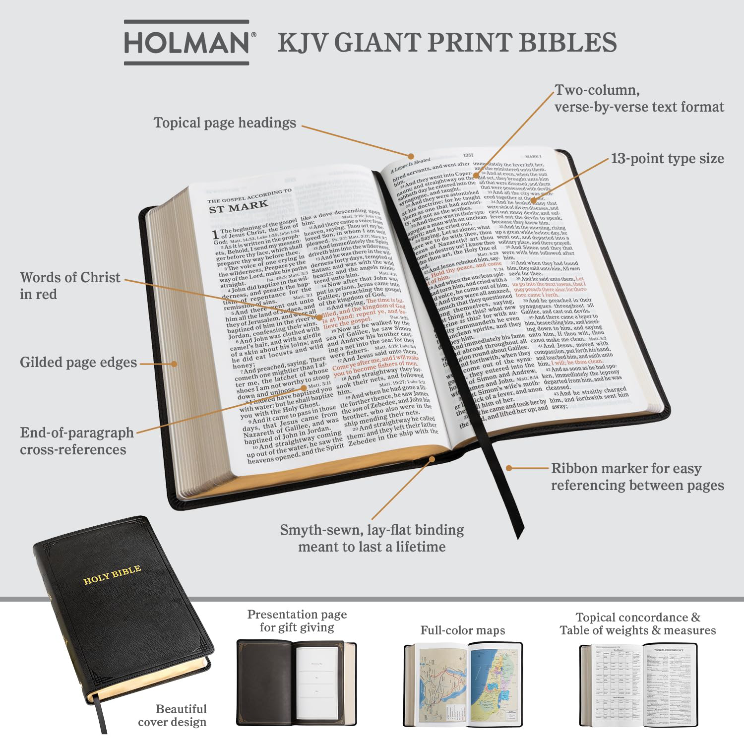 Fast Shipping Great Customer Support Satisfaction Guaranteed DESCRIPTION Shipping Shipping Shipping All domestic packages are shipped for Free (Unless other shipping method was selected during the checkout) Most items ship and arrive much sooner than the estimate delivery date. Usually within 2-3 days from payment. However, we have longer estimates to compensate for the occasional delay or supply chain breakdown. We do not accept P.O. BOXES - PLEASE PROVIDE A PHYSICAL ADDRESS Return Return Return In the event that you would like to return your purchase, we allow returns that are processed within the defined return date (the return date is to be found in the return policy/shipping and handling section) Please contact us for a return authorization and the return shipping address. Payment Payment Payment PayPal is our preferred method of payments it's the quickest, easiest and most secure way to pay for your goods or services online. PayPal offers buyer and seller protection should there be a problem. If you do not have a PayPal account, to get started and buy your first item with us is very easy. Simply click on the 'Buy It Now' button and follow the eBay checkout steps. Select PayPal as the payment method you then will be given the chance to enter your card details in to PayPal's secure checkout in order to pay for your order. Once the payment has been made, you will then be given the opportunity to make your own PayPal account to make paying for your items in the future very easy. Should there be a problem with payment please do let us know. Feedback Feedback Feedback Customer satisfaction is very important to us. If you have any problem with your order,please contact us and we will do our best to make you satisfied, please do not leave a negative feedback before we resolve your problem. We guarantee that your issue will be solved quickly. As long as you are happy with your purchase of , please leave us a positive feedback. Your feedback is very important to us it affects our search placement on eBay. We will leave a positive feedback for you in return automatically once we receive your feedback. Contact Us Contact Us Contact Us If you have any queries, please contact us via ebay. We usually respond within 24 hours on weekdays. Thank you for visiting our ebay store! Introducing the Giant Print, King James Version Holy Bible, with Cross-References – where readability meets reverence. Immerse yourself in the sacred text with an easy-to-read 13-point type, perfect for personal study, gifting, devotions, or impactful preaching. This edition features a durable Leather Touch cover with gold foil stamping, and classic heat burnished accents, in addition to Smyth-sewn binding for lay-flat convenience. The elegant design includes red-letter words of Christ, gilded page edges, full-color maps, and cross-references at your fingertips. Whether for ministry or personal reflection, this Bible, with its premium features, brings the timeless beauty of the King James Version to life. It's an invitation to explore the richness of God's Word with clarity and grace. FEATURES: The KJV Giant Print Reference Bible features the authorized Pure Cambridge Edition text of the King James Version (KJV) translation. The KJV is one of the best-selling translations of all time and captures the beauty and majesty of God’s Word for those who love the rich heritage and reverent language of this rendering of the Holy Bible. Discover meaningful gifts for Christmas at the Lifeway Brand Store. For over 400 years, the King James Version (KJV) has been the trusted translation for millions of Bible readers, shaping the worship of generations. The KJV is one of the best-selling translations of all time and captures the beauty and majesty of God’s Word for those who love the rich heritage and reverent language of this rendering of the Holy Bible. KJV Giant Print Holy Bible Black LeatherTouch Red Letter with Maps Click here to see description Fast Shipping Great Customer Support Satisfaction Guaranteed DESCRIPTION Shipping All domestic packages are shipped for Free (Unless other shipping method was selected during the checkout) We ship within two business days of payment, usually sooner Standard FREE shipping takes between 3-5 business days Expedited shipping takes between 2-3 business days Overnight shipping takes between 1-2 business days We do not accept P.O. BOXES - PLEASE PROVIDE A PHYSICAL ADDRESS We Ship Globally using ebay's GSP, the item is sent to a logistic center in KY and shipped from there to the rest of the world. International customers are responsible for all duties and taxes Contact your local authority for questions related to the amount of duties or taxes you will be responsible for Return In the event that you would like to return your purchase, we allow returns that are processed within the defined return date (the return date is to be found in the return policy/shipping and handling section) Please contact us for a return authorization and the return shipping address. Please contact us for a Return Merchandise Authorization (RMA) number. We advise you to use a reputable carrier service when returning your goods. Please pack all returns appropriately. We ship globally Via eBay's global shipping program (GSP). Thus we don't cover returns for items shipped globally. Buyers returning such items will be refunded ONLY for the item's cost and not for the shipping. please check the Voltage information and make sure it matches the one in your country. In case it's not stated in the description, do ask us. Payment PayPal is our preferred method of payments it's the quickest, easiest and most secure way to pay for your goods or services online. PayPal offers buyer and seller protection should there be a problem. If you do not have a PayPal account, to get started and buy your first item with us is very easy. Simply click on the 'Buy It Now' button and follow the eBay checkout steps. Select PayPal as the payment me