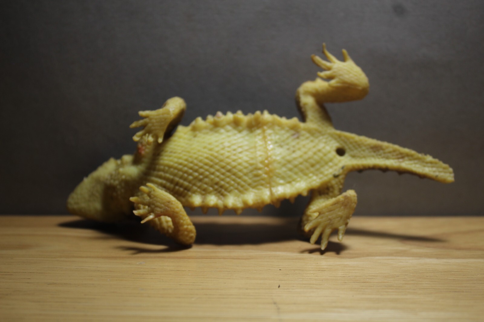 Is missing the end of its tail but has no flaws otherwise. Not exactly sure of the manufacturer, but I believe it's K&M or something alone that line. The spikes are fairly hard and sharp, so small children aren't recommended.