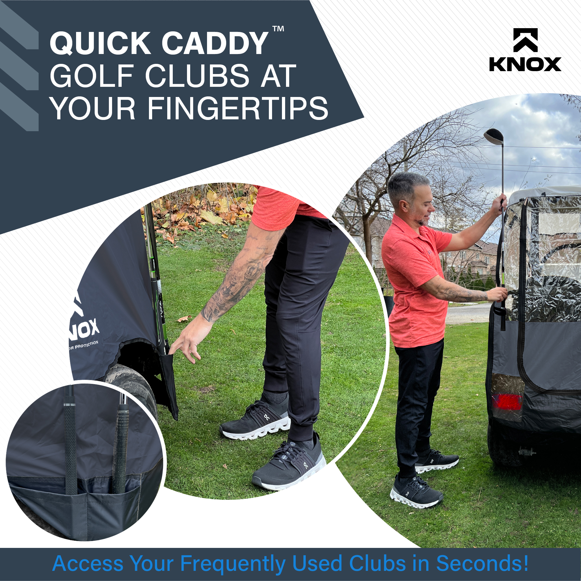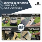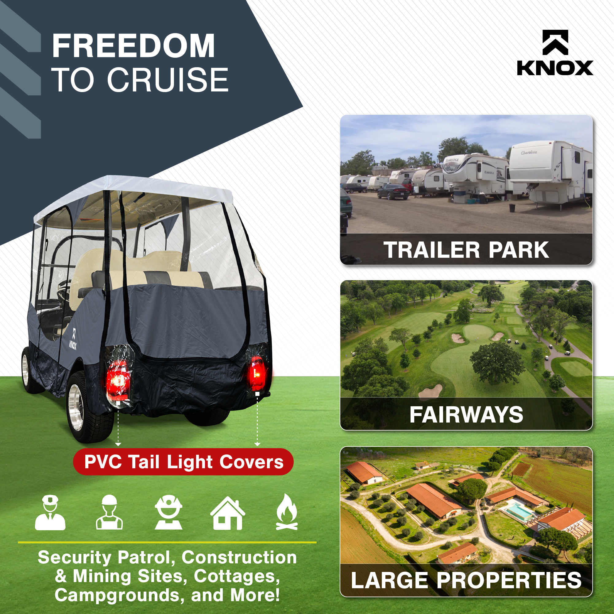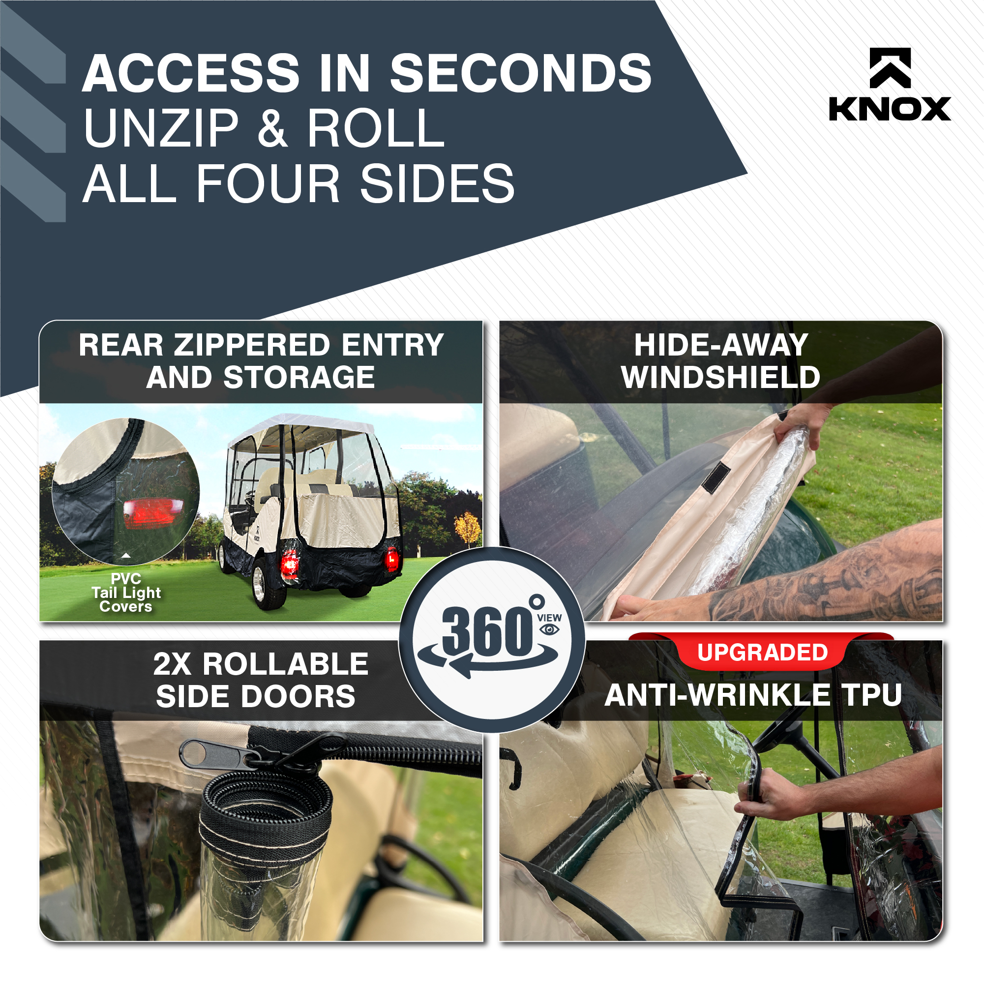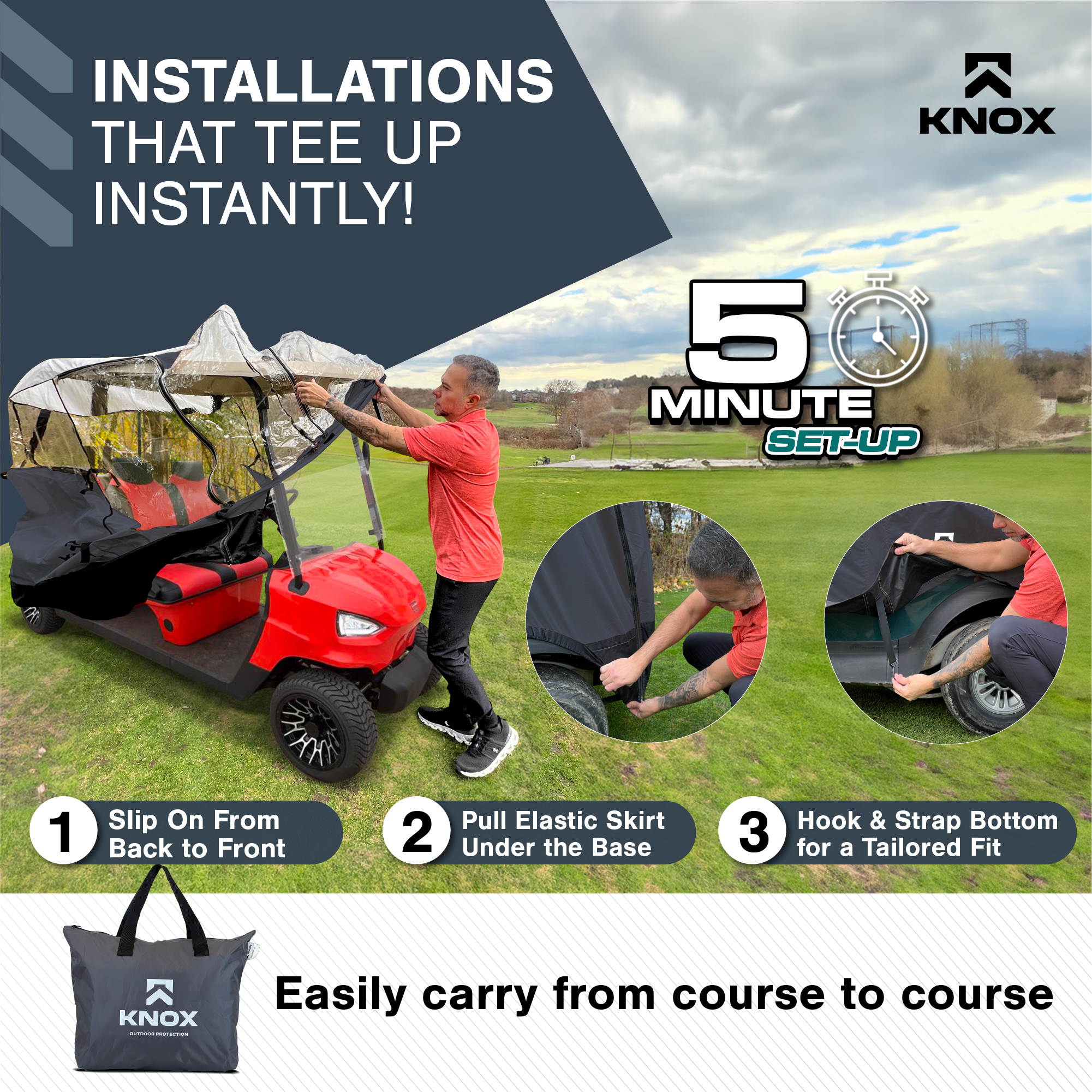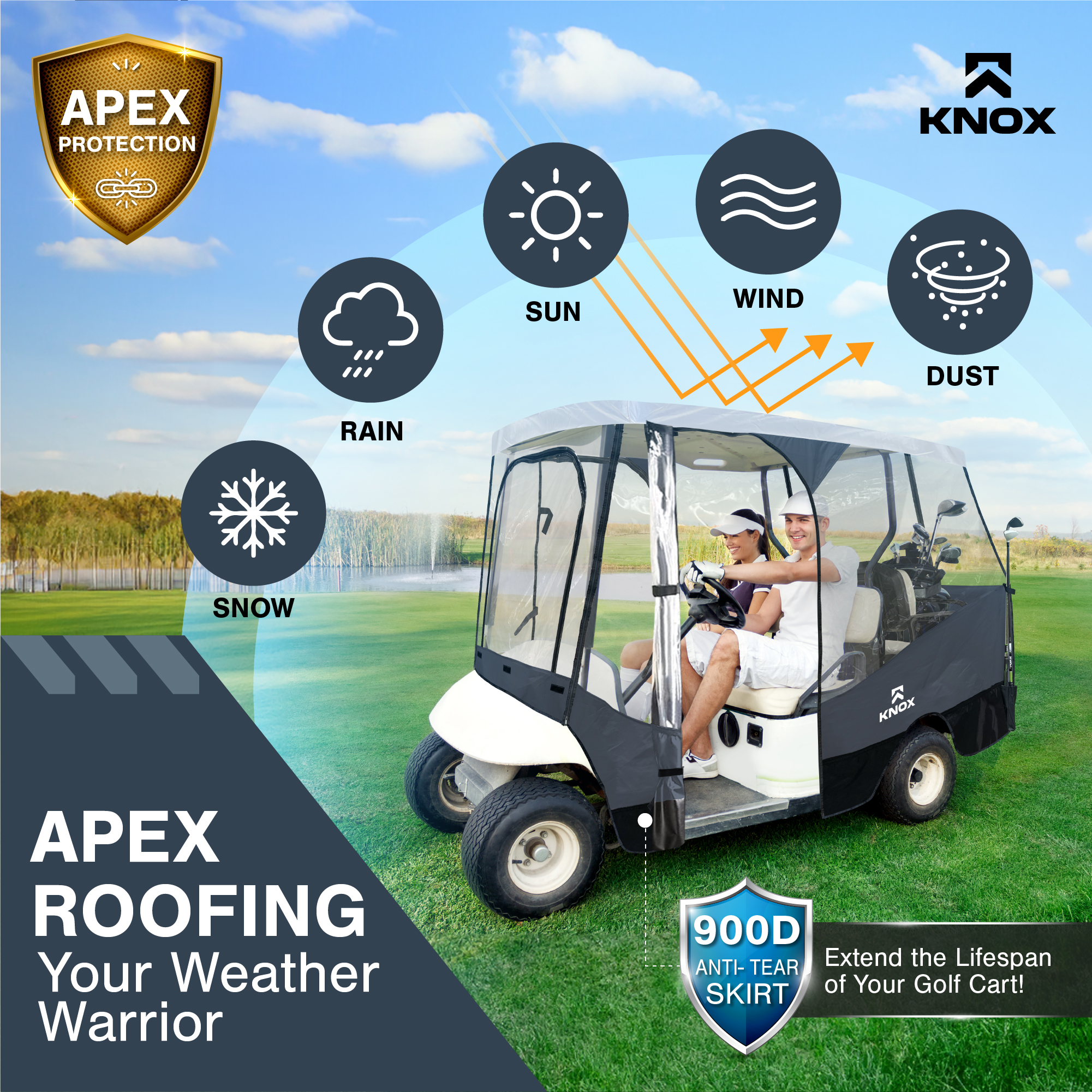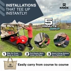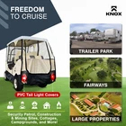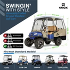 KNOX Golf Cart Enclosure, 2+2 Seater, 600D Transparent Golf Cart Cover Storage KNOX 4 Person Golf Cart Enclosure, 2+2 Seater, 600D Transparent Golf Cart Cover Storage, Golf Cart Accessories, Up to 61.5"L roof, Compatible with EZGO TXT/RXV, Yamaha, Club Car DS/Precedent, Evolution Features: [UNIVERSAL FOR MOST GOLF CARTS] KNOX has engineered a golf cart winter cover that fits popular brands, compatible with Club Car DS/Precedent, EZGO TXT/RXV, Yamaha, ICON, and Evolution. Slip on your EZ GO golf cart cover onto any standard 2+2 passenger golf cart, 2 front 2 rear-facing seat bench. Quick setup and removal, requiring only five minutes for full assembly, and conveniently comes with a carrying bag for easy transport. Our universal golf cart enclosure fits roofs up to 61.5" in length. [QUICK CADDY - EASY GOLF CLUB ACCESS] Say goodbye to the frustration of sifting through your golf clubs to locate a specific one. KNOX's Quick Caddy offers 4 convenient pockets designed for quick and effortless retrieval of your 4 frequently used golf clubs. Positioned at the rear of our EZGO golf cart cover, these dedicated slots make it a breeze to access your putter or driver in seconds! These smart holders are crafted to ensure a hassle-free club insertion and removal. [UNZIP & ROLL FOR EASY ACCESS] Our fairway golf cart cover was designed with 360-degree Panoramic Transparent Windows for clear visibility. It features doors on both the driver and passenger side, a hide-away golf cart windshield, and convenient rear club access. KNOX has engineered a user-friendly unzip-and-roll system, with double-sided zippers and PVC roll-up windows for fresh ventilation. Our Club Car cover can be used as waterproof storage to protect your EZGO golf cart accessories. [APEX ROOFING: FOR MULTI-YEAR USE] Our exclusive APEX roof material sets itself apart from other golf cart rain covers in the market. It has been meticulously engineered to effectively shield your electric golf cart from all-season elements such as sun, hail, snow, and rain. With its remarkable waterproof, all-season, and tear-resistant qualities, it offers durability for years of use. In addition, this cover has a 900D synthetic anti-tear skirt to shield against overtime wear and tear. [PERFECT FOR FAIRWAYS/TRAILER PARKS/LARGE PROPERTIES] Don't let poor weather impede your mobility - remain cozy and sheltered as you glide through the golf course, cruise your neighborhood, explore the trailer park, and traverse your property. Our Club Car enclosure is also suited for security patrols, construction, and mining sites. Prioritizing safety at every turn, our golf cart covers include transparent PVC tail light covers, allowing for safe rides alongside other vehicles. Specifications: Style: Golf Cart Size: 4-Seater Fit: 61.5"L Roof Material: 600D Polyester Brand: KNOX Condition: 100% Brand New Package Includes: 1x Golf Cart Cover 1x Storage Bag Note: Many carts are custom made and can have extended roofs. This cover will only fit standard size carts. Please measure before purchasing Upgrade Shipping to 3-Day Choose Expedited shipping option at checkout. California Customers: ⚠️ WARNING: This product may contain chemicals known to the State of California to cause cancer, birth defects or other reproductive harm. For more information go to P65Warnings.ca.gov All trademarks remain property of their respective holders, and are used only to directly describe the products being provided. Their use in no way indicates any relationship between us and the holders of said trademarks. The product being sold in this listing is not DOT approved unless otherwise stated. All goods sold are not DOT approved, they are for off road use only. Laws concerning this product vary from state/province to state/province. Your state/province may prohibit its use on public roads or restrict its use to novelty, show use, off-road areas, or race facility areas only. In some states/provinces off-road uses are also prohibited. The manufacturer and retailer assume no responsibility for any use or application of this product in violation of any applicable law. Before installing this product, please check your state/provincial and local/municipal laws and regulations.
