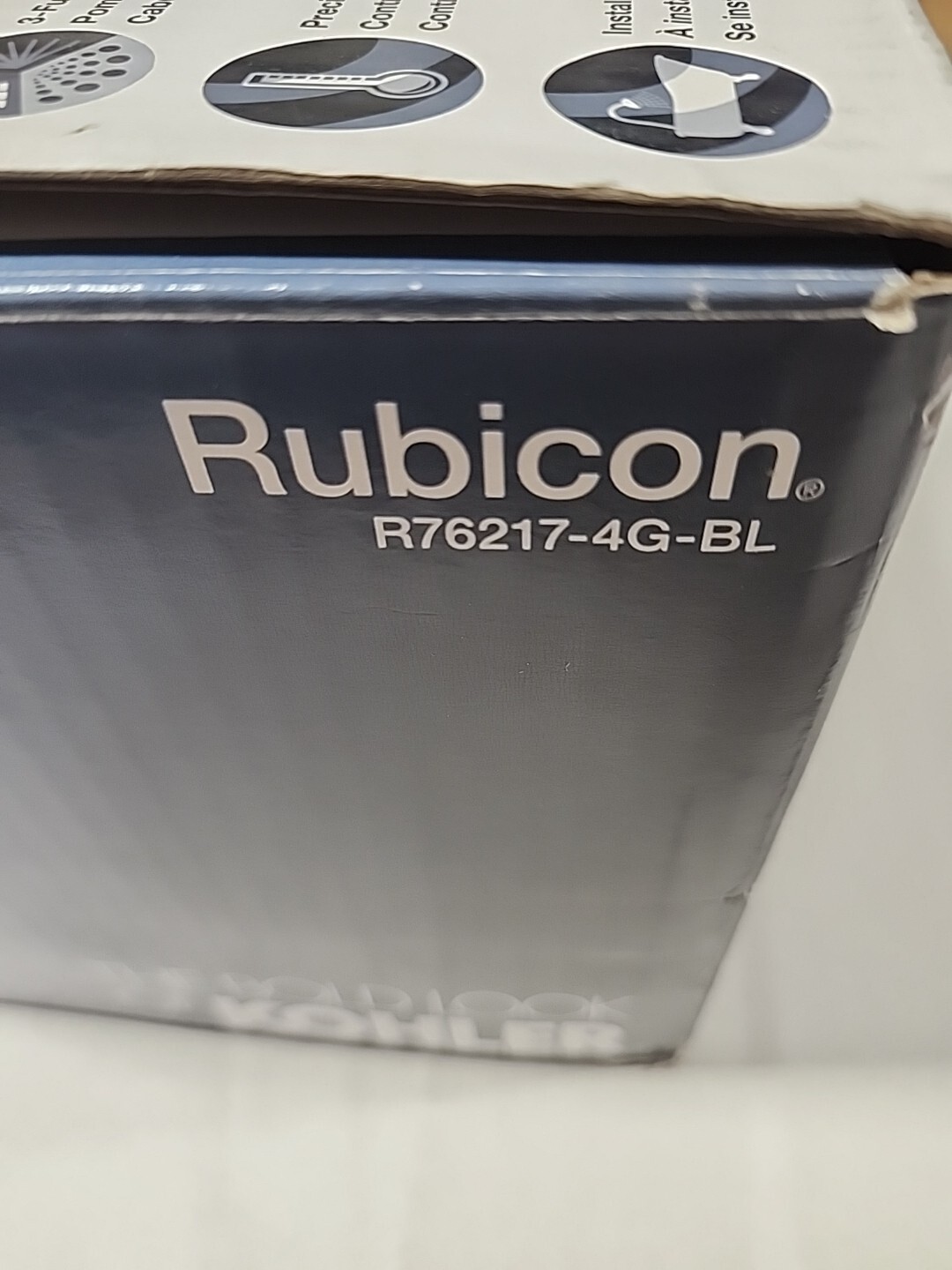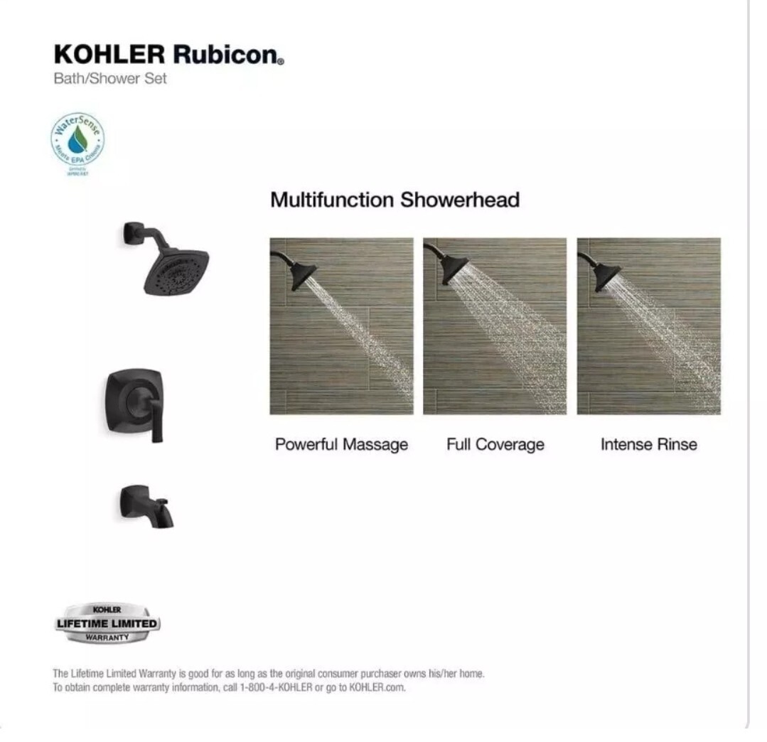 Upgrade your shower experience with the KOHLER Rubicon 1-Handle 3-Spray Tub and Shower Faucet R76217-4G-BL in matte black. This modern faucet set is suitable for showers and features a square shower head with adjustable angle, manual temperature control, and a flow rate of 1.6 gpm. The faucet is made of corrosion and bacteria-resistant metal and is water conserving, making it an eco-friendly choice. The unit type is a single-hole unit with a rear wall fed water feed and a minimum pressure of 45 psi. The faucet comes with a lever handle, 1 sprayer head, and 1 valve. Assembly is required for the KOHLER Rubicon 1-Handle 3-Spray Tub and Shower Faucet R76217-4G-BL, but it is easy to install. Upgrade your bathroom with this stylish and functional shower set today.