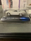 This is a Konami Mini Car Collection die-cast model of a Mazda Cosmo Sport (L10B) from 1968 in a 1:64 scale. The car is coloured in grey and is a representation of the classic Mazda Cosmo Sport model from the late 1960s. This collectible toy car is brand new, coming in its original packaging box, suitable for fans of die-cast vehicles or collectors of miniature car models.