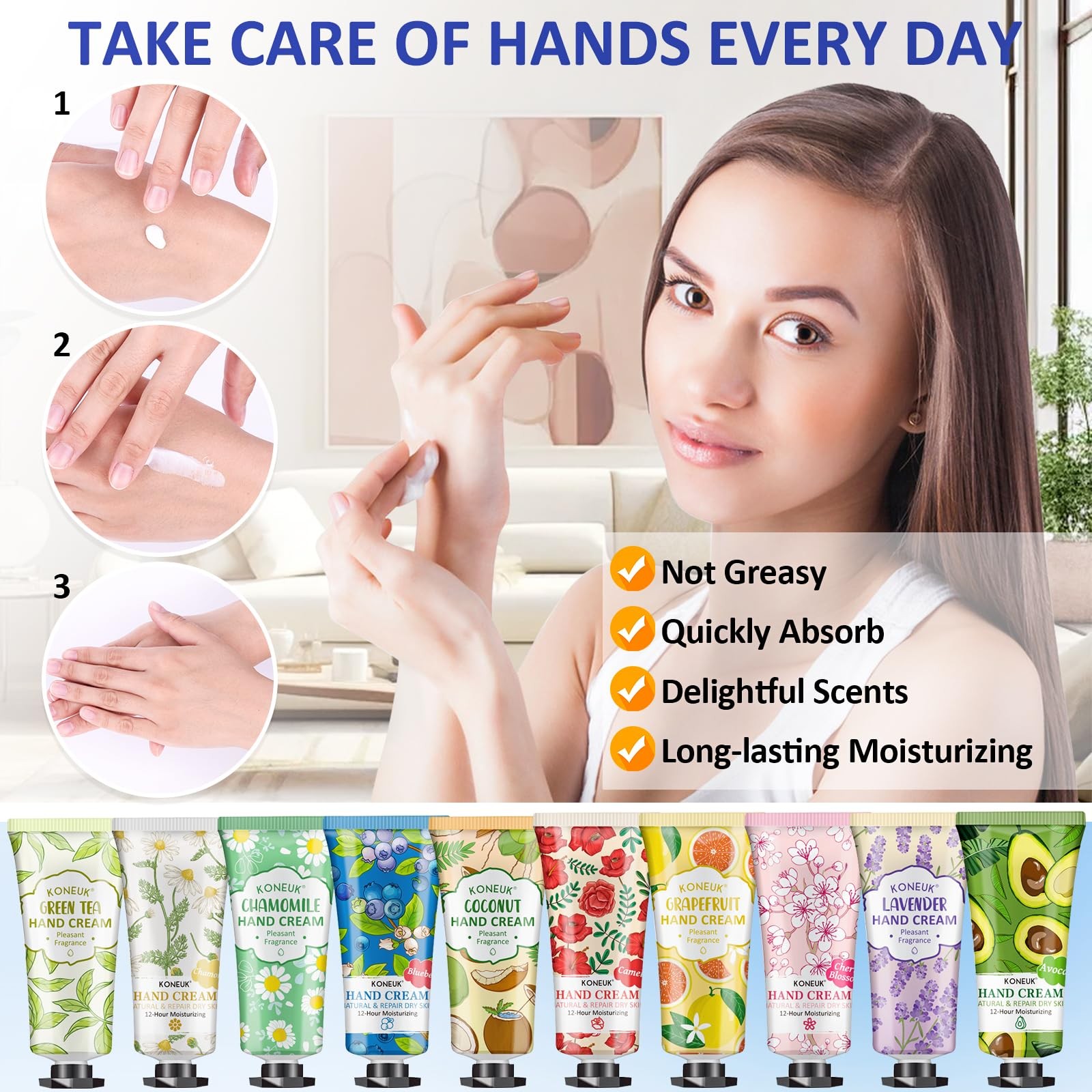32 Pack Hand Cream Gifts Set For Women Including rose,chamomile,coconut,avocado,peach,blueberry,eucalyptus,honey,cherry blossom,lavender,camellia,lemon,shea butter,grapefruit,green tea,aloe,16 different scents Our hand cream is exquisitely packaged with a variety of colors and fragrances,making it perfect for giving to women,mothers,colleagues,teachers and nurses.They are perfect christmas gifts,valentine's day gifts,mothers day gifts,bridal wedding favors,teacher appreciation gifts,nurse week gifts and baby shower favors. Bulk Hand Lotion Travel Size Our hand cream has a small volume and is very suitable for carrying around without taking up too much space.You can put hand cream in your car,backpack,drawer,and desk.You can even put it in your pocket and wallet,and use them anytime,anywhere. 【Perfect Gifts for Women】Our hand cream is exquisitely packaged with a variety of colors and fragrances,making it perfect for giving to women,mothers,colleagues,teachers and nurses.They are perfect christmas gifts,valentine's day gifts,mothers day gifts,bridal wedding favors,teacher appreciation gifts,nurse week gifts and baby shower favors. 【32Pack Hand Cream Gifts Set】Rose,chamomile,coconut,avocado,peach,honey,cherry blossom,lavender,camellia,blueberry,eucalyptus,lemon,shea butter,grapefruit,green tea,aloe,16 different scents.You can choose a favorite fragrance every day to have a good mood,you can also share these mini hand lotion with friends,coworkers and family. 【Moisturizing and Nourishing】Hand lotion is rich in plant extracts,aloe essence,shea butter and Vitamin E,hand cream is very effective for dry cracked hands,regularly applying these hand creams can keep your hands smooth and hydrated. 【Bulk Hand Lotion Travel Size】Our hand cream has a small volume and is very suitable for carrying around without taking up too much space.You can put hand cream in your car,backpack,drawer,and desk.You can even put it in your pocket and wallet,and use them anytime,anywhere. 【Suitable for All Skin Types】Hand cream contains a variety of plant ingredients,non greasy,mild and non irritating,pleasant fragrance,long lasting moisturizing and nourishing,mini hand lotion is very effective for dry cracked and rough hands.