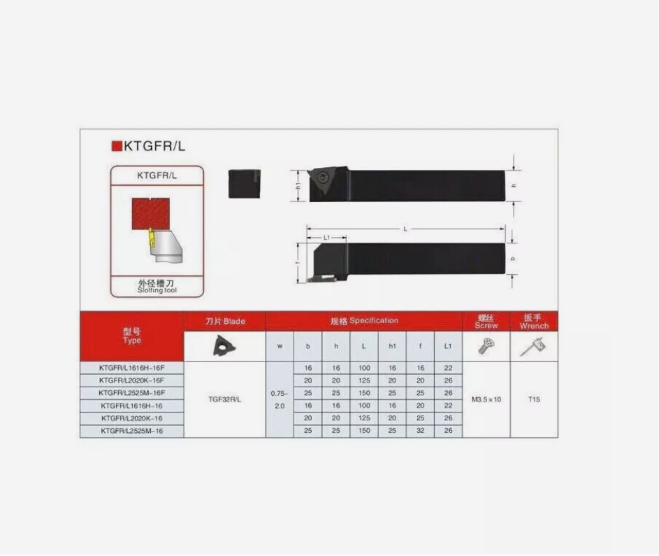 Specification: Brand new Holder Model : KTGFR 1616H16F Suitable insert: TGF32R ( Not included ) direction: right hand material : Alloy steel Wrench:T15 screw: M3.5*10 Color: as picture shows Package included: 1P KTGFR 1616H16F