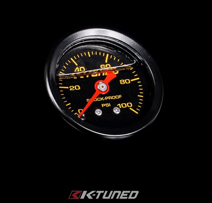 K-Tuned KFR-FPG-B55 Fuel Pressure Gauge (BLACK) Marshall 0-100 psi UNIVERSAL Part # KFR-FPG-B55 K-Tuned Applications All K-Series engines Universal * Also check out K-Tuned 1/8 NPT 90 deg and 45 deg fittings that can be used to change the angle of the gauge to make it more visible. K-Tuned Fuel Pressure Gauges are liquid filled to prevents failure due to the vibration and constant movement of the engine. The liquid filled (shock proof) design ensures the needle remains steady while the engine is running. Cheaper and less accurate fuel gauges are easily spotted because the needle tends to bounce around making them difficult to read. Our quality gauge accurately reads pressure between 0-100 psi. It is finished in all black with yellow lettering/numbers, red needle and our K-Tuned logo on the bezel.