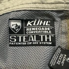 *Left side pocket has loose stitching as pictured but doesn’t affect performance of pants The updated KÜHL RENEGADE™ CARGO CONVERTIBLE PANT opposes conventional thought to deliver superior performance, comfort and style. Cut from innovative DURALUX™, the durable softshell fabric feels like cotton to the touch. Stronger, more breathable, and boasting superior anti-abrasion and quick dry properties, DURALUX with DWR outperforms standard nylon and provides UPF 50 sun protection. Our patented, innovative STEALTH™ patented zip-off system eliminates the fabric flap while keeping the zipper running smoothly and efficiently. The gusseted crotch and full fit allow freedom of movement, while the waistband is slightly peached for increased wicking performance, faster drying time and unmatched comfort. Mesh pockets provide ventilation, and compartment pockets inside the large cargo pockets keep valuables secure and organized. Easy care, wash and wear make the RENEGADE CARGO CONVERTIBLE PANT your go-to choice. Features FULL FIT Durable 2-way stretch fabric has brushed back and dries quickly for komfort with DWR Waistband lined with soft micro-chamois for unmatched comfort Stealth™ patented zip-off system Zips off to 10” short Gusseted crotch Compartment pockets inside large cargo pockets keeps items secure and organized Mesh pockets Articulated knees Easy care, wash and wear UPF 50 Specifications Fabric: main body: DURALUX™ 95% Nylon, 5% Spandex with DWR | 5 oz/sq. yd; 170 GSM
