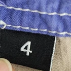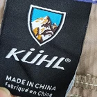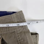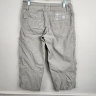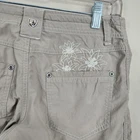 Women's Kuhl tan hiking capri pants w/ white floral embroidery on back pocket, size 4. Garment is in good preowned condition with no stains, tears, or holes. Measurements are approximately 15" across the waistband with a 19" inseam. Material content is 63% cotton/36% nylon/1% spandex