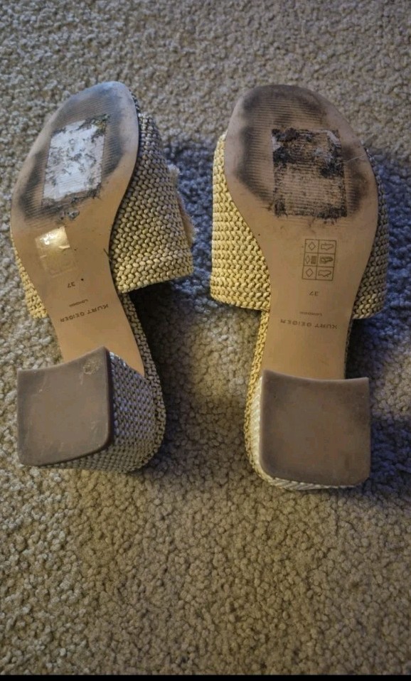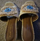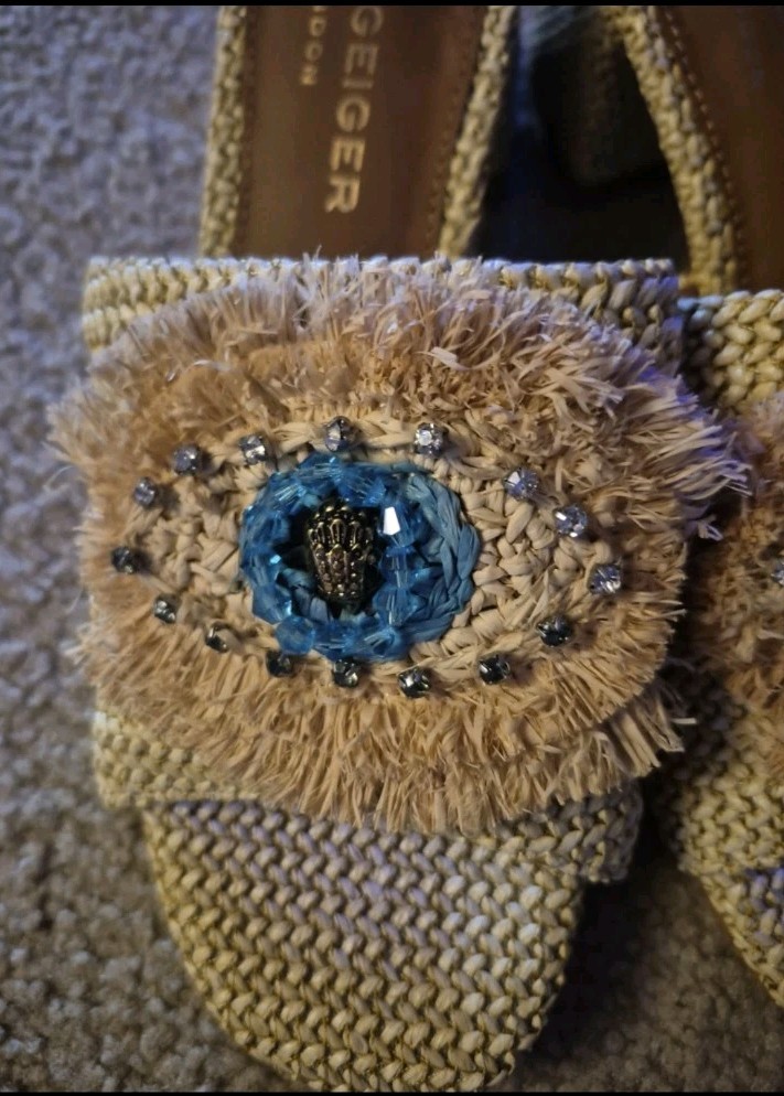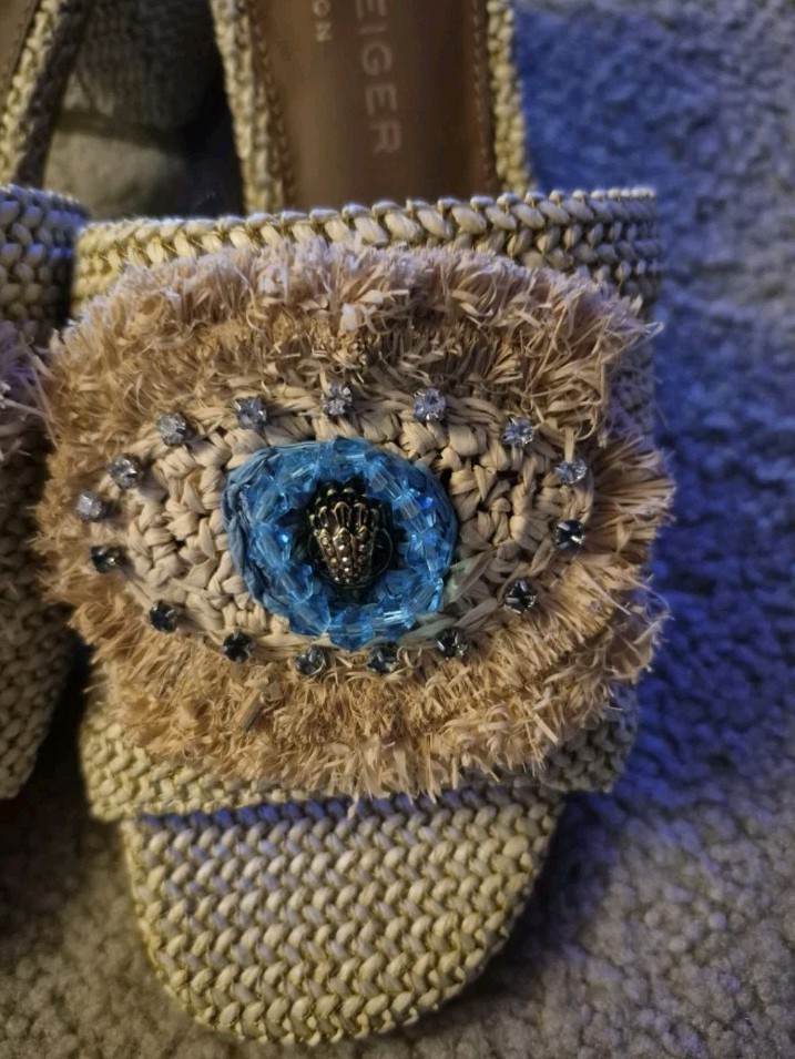 KURT GEIGER EVIL EYE SANDALS SIZE 7 MATERIAL IS RAFFIA LIGHT BROWN ON TOP OF SHOE IS AN OVAL WOVEN STRAW WITH BEAD AND RHINESTONE AND CHARM TRIM THE RHINESTONES ARE IN THE SHAPE OF THE EYE KURT GEIGER EAGLE HEAD LOGO CHARM IN CENTER BLUE BEAD ACCENTS AROUND IT LOW CHUNKY HEEL EASY TO WALK IN THESE ARE STUNNING WORN ONCE IN EXCELLENT CONDITION SOLD OUT!!! 100% AUTHENTIC