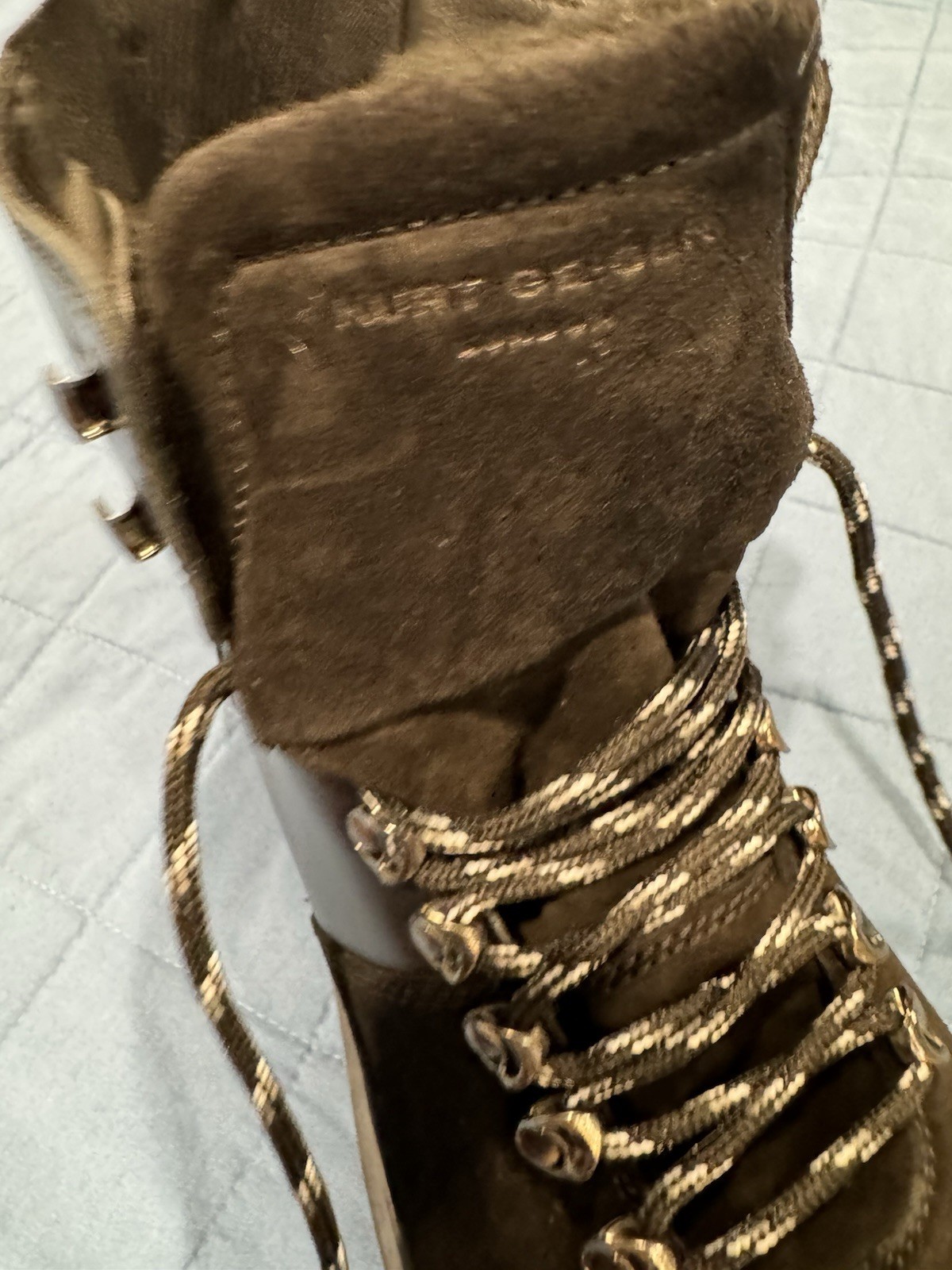 The product is a pair of KURT GEIGER men's casual / hiking shoes in UK size 11, US size 12, and EU size 46. These black leather sneakers feature suede a round toe shape and are suitable for casual occasions during the winter, fall, and spring seasons. The shoes are designed with a mesh fabric type and display the character of Kurt in a stylish and comfortable sneaker style.