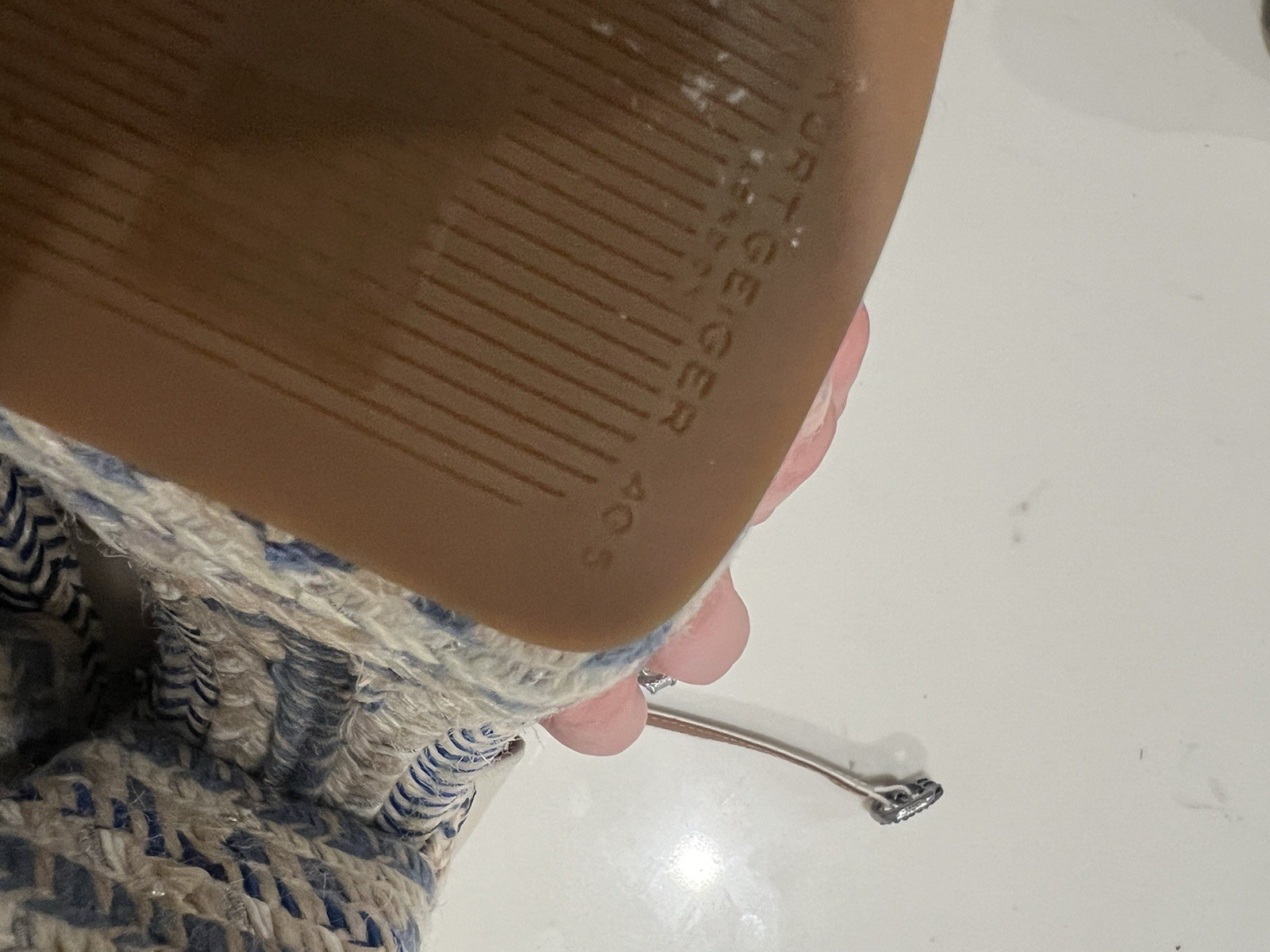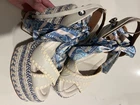 The product is a pair of Kurt Geiger Chelsea scarf platform heels in size 40.5 (US size 9.5). These stylish heels feature a multicolor leather upper, a platform style, and a comfortable heel design. The brand Kurt Geiger is known for its quality and trendy footwear, making these heels a perfect addition to any woman's shoe collection. Floor models No box