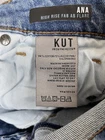 Brand: KUT from the Kloth Style: Womens Ana High Rise Fab Ab flare jeans in a medium blue wash stretch denim with raw frayed hems and light distressing. Department: Women; Size on tag: 00. Color: Medium blue wash; Pattern: Solid with subtle fading and whiskering. Material: 94% cotton, 5% polyester, 1% spandex stretch denim; made in China. Closure: Zip fly with logo button closure at the waist and belt loops around the waistband. Details: Classic five-pocket styling with front scoop pockets, coin pocket, and back patch pockets; intentionally distressed back pockets and hem details; raw cut frayed hems; contrast stitching and logo hardware. Fit: High-rise waist with Fab Ab front panel designed to smooth and flatter through the tummy; slim through the hip and thigh with a flared leg opening. Style/Model information: Inner waistband and tags read KUT FROM THE KLOTH and ANA High Rise Fab Ab Flare; care label lists 94% cotton, 5% polyester, 1% spandex, RN# 58539, made in China; inner white tag lists Style# KP1725MA4, Cut# 153469, Size 00; exterior hangtag reads HIGH RISE ANA FAB AB FLARE and .