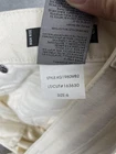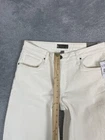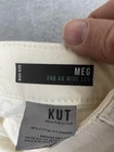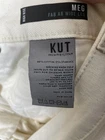 THESE WERE CUFFED, AND THE CUFFS HAVE BEEN CUT LOOSE KUT From The Kloth Meg Fab Ab Wide Leg women's jeans in white Candle wash stretch denim with a high-rise wide leg fit. Brand: KUT From The Kloth Style: Meg Fab Ab High Rise Wide Leg jeans in solid Candle (white) light wash denim with a relaxed wide-leg silhouette. Department: Women Color: Candle, an white/off-white light wash; Pattern: Solid. Tag size: 6 Material: 98% cotton, 2% spandex stretch denim (per care tag); made in China. Closure: Zip fly with logo button closure at the waist and belt loops around the waistband. Details: High-rise waist for a flattering fit through the midsection, wide leg opening for an easy relaxed drape, classic five-pocket layout with front scoop pockets, coin pocket, and back patch pockets, tonal stitching and silver-tone hardware, finished hems suitable for casual outfits across seasons. Branding: Metal KUT From The Kloth plate at the back waistband, interior waistband label reading HIGH RISE MEG FAB AB WIDE LEG, and branded front button and rivets. Interior label information: Gray care label lists 98% cotton/2% spandex, machine wash cold inside out with like colors, tumble dry low or for best results line dry, warm iron if needed, and notes RN# 58339 and made in China; inner production label lists STYLE: KG1980MB2, LT/CUT# 163630, size 6. Hangtag information: Exterior retail tag lists style KG1980MB2, color Candle, size 6, and UPC: 198782121270. New high-rise Meg Fab Ab wide leg jeans from KUT From The Kloth offering soft white stretch denim and a relaxed, modern silhouette.