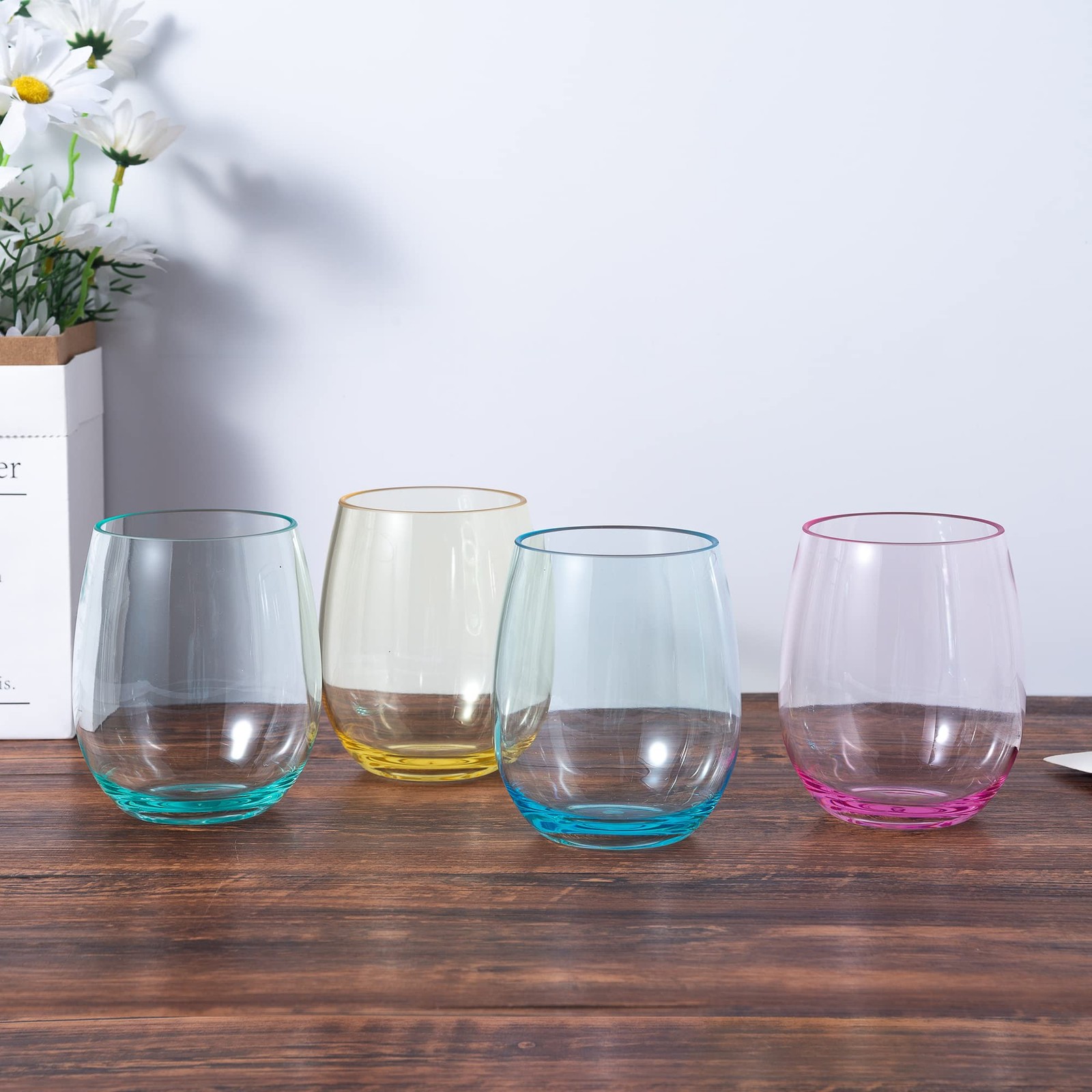Classic Colorful 18-ounce Acrylic Wine Glasses Enjoy your favorite beverage in these crystal-clear drinking cups. Perfect for everyday use at family dinners and entertaining at a home bar. Serve guests soda, lemonade, or iced-tea with these durable cups while dining outdoors on the patio or poolside. The superior clarity, thick base, and straight walls compose the hammered design of the Classic Water Tumblers. They fit into any style or theme. BPA-free and Top Rack Dishwasher Safe We are committed to using only the best BPA-free, food safe materials to create products you can feel good about using every day. Consumer safety and peace of mind is our top priority. Our products are made from durable materials that will not shatter like glass. Place on the top rack or hand-wash to maintain the clarity of products. Enjoy stylish designs and colors that will last. Premium quality plastic stemless wine glasses, Inclues 4pcs 18-ounce stemless goblet: 3.75"Dia x 4.25"H Classic style,durable material that will not shatter like glass | top rack dishwasher safe,If hand washing, do not use abrasive sponges or brushes. Perfect everyday drinking cup; great for indoor dining and outdoor parties. Crafted in crystal-clear shatterproof/BPA free acrylic plastic, this drinkware collection is designed to withstand the demands of household use and still be stylish. Quality service-We stand behind our premium products and are dedicated to making our customers happy. Not fully satisfied with your purchase? We will give you a 100% refund or replacement-no questions asked!