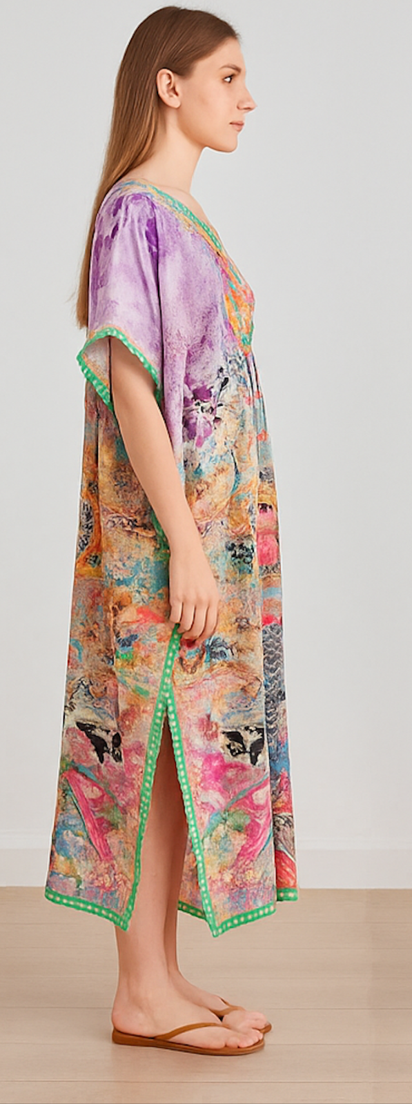 About this item SIZE: one size women's kaftan dress, fits US size M, L, XL QUALITY: made of light and breathable fabric, keep you cool in the summer FEATURES: beautiful print and color, offers enough coverage, oversize design and side split for easy fit MATCHING: can wear as a lounge attire at home or a beach coverup matching with bikini, bathing suit, sunglasses OCCASION: perfect swimwear cover ups for beach, swimming pool, loungewear, waterpark, tanning salon, cruise, honeymoon