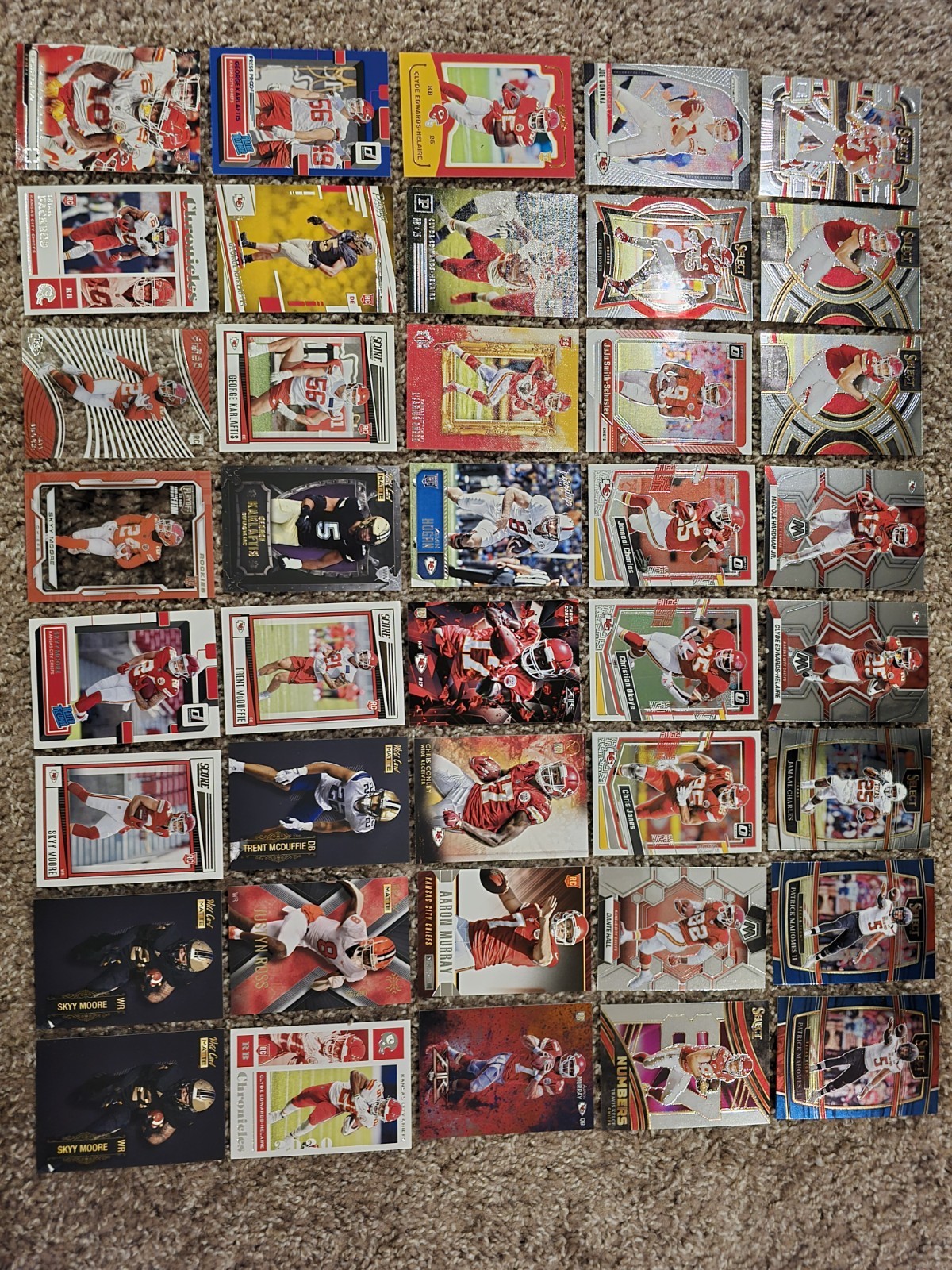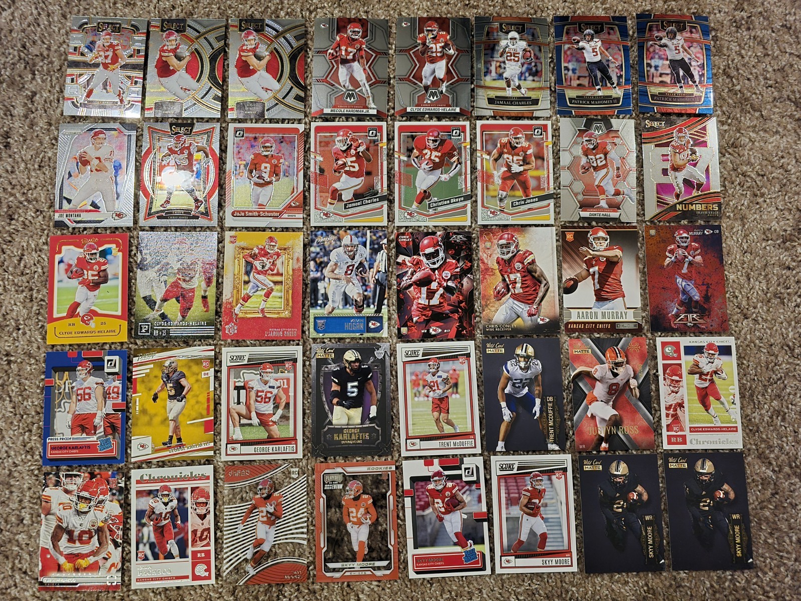 Kansas City Chiefs 200 Football Card Lot, Auto, RCs, Prizms, Refractors, Mahomes Includes Samie Parker 2004 Bowman rookie auto. Includes rookie cards of Carson Steele, Jaden Hicks, Skyy Moore, Trent McDuffie, Darwin Thompson, Nick Bolton, Demarcus Robinson, Chris Conley, Dexter McCluster, Chamarri Conner, Rashee Rice, Isiah Pacheco, George Karloftis, Bryan Cook, Justyn Ross, Shane Buechele, Clyde Edwards Helaire, Dwayne Bowe, Xavier Worthy, Kamal Hadden, Emani Bailey, Kingsley Suamataia, Ljarius Sneed, Kevin Hogan, Aaron Murray Includes cards of Patrick Mahomes, Travis Kelce, Kareem Hunt, Alex Smith, Eric Berry, Joe Montana, Derrick Thomas, Jamaal Charles, Tyreek Hill, Chris Jones, Juju Smith Schuster, Christian Okoye, Dante Hall, Mecole Hardman, Tony Gonzalez, Harrison Butker, Neil Smith, Tyrann Mathieu, Len Dawson, Priest Holmes, Marcus Allen Includes cards from Panini, Prizm, Bowman Chrome U, Mosaic, Phoenix, Obsidian, Topps Chrome, Platinum, Finest, Select Draft Picks, Optic, Prestige, Score, Contenders, Illusions, Chronicles, Fire, Upper Deck Collectors Choice, Fleer Ultra, Absolute, Rookies and Stars, Donruss, Wild Card Matte, Valor, Elite, Totally Certified