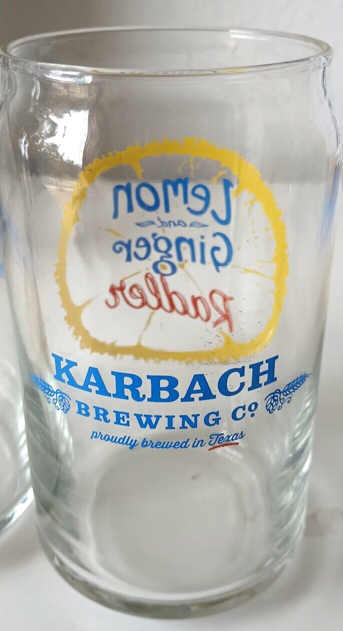 This is a colorful and fun set of two Karbach Brewing Company glasses with "Lemon and Ginger Radler" on the front and "KARBACH BREWING CO. proudly brewed in Texas" on the back. The glasses are clear glass with vibrant Lemon slices in yellow on the front and the wording in blue and red within the center. The wording on the back is in blue with the word Texas underlined in red. PERFECT! These can make excellent collectors glasses, gifts to others, or for your regular use! They stand 5 1/4" tall and are 3" wide with a slightly tapered mouth at the top. Check out the pictures for more detail. I have 100% excellent feedback, ship daily, and will be happy to get these out to you quickly. Shipping will be $8.50 in the Continental USA (that is the actual cost only). Thank you!