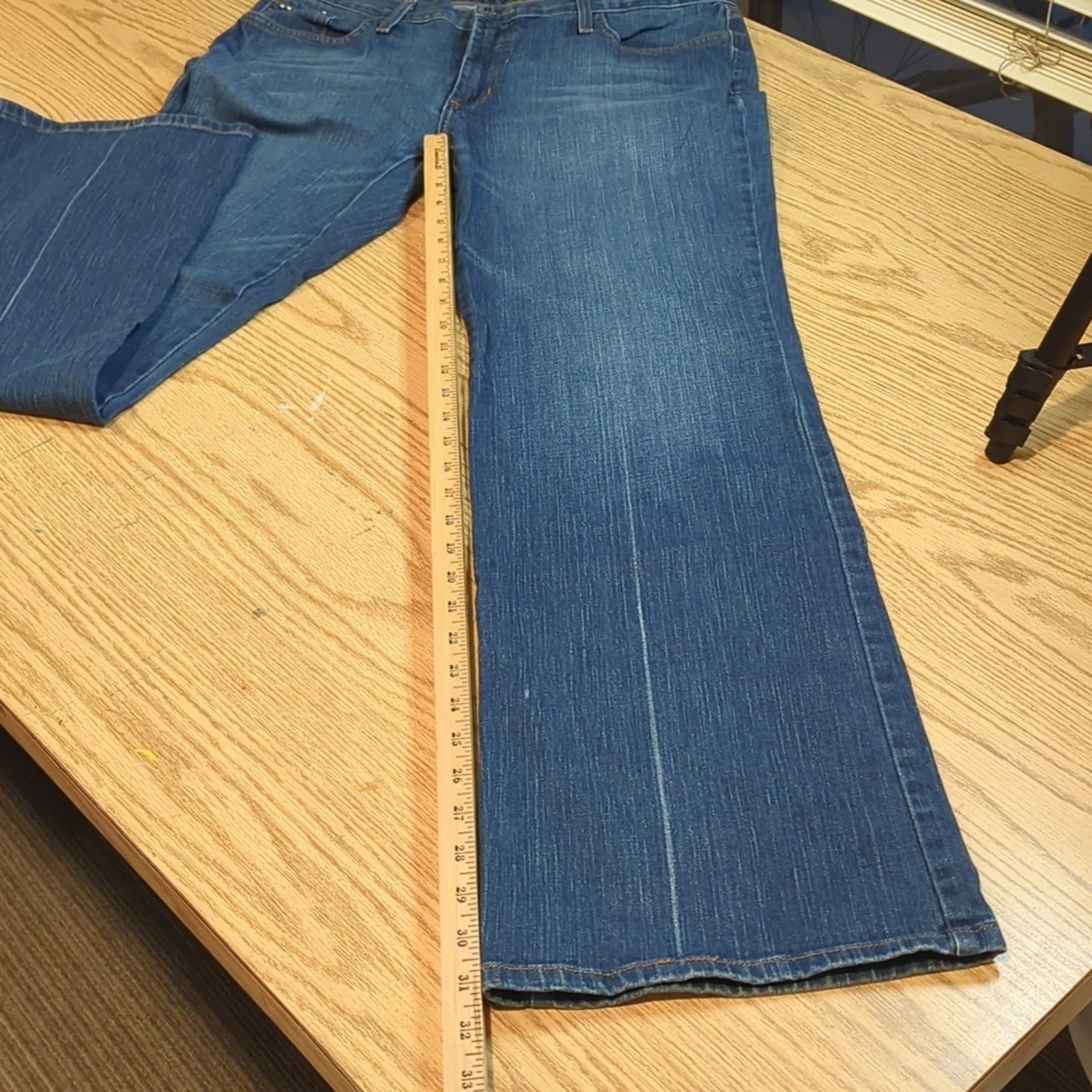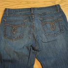 Karen Kane Straight Leg Jeans Medium Blue Wash Size 14 9" Rise 31" Inseam Missing 4 studs on left back pocket 99% Cotton 1% Spandex Good Used Condition