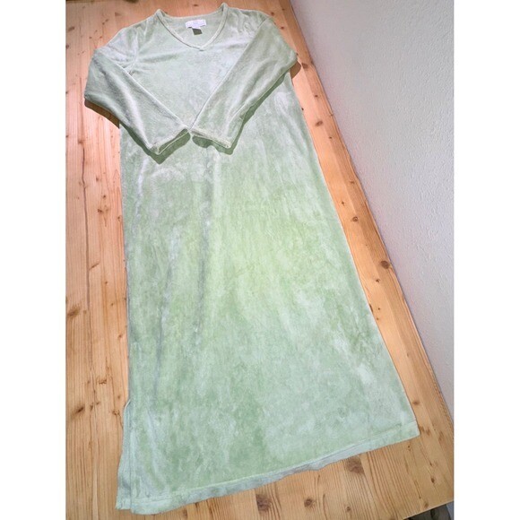 A plush lounge dress from Karen Neuburger, perfect for relaxing in comfort. This dress features a flattering V-neck design and long sleeves, making it ideal for cooler evenings. The soft, plush fabric offers a cozy feel against the skin. It also has side slits at the bottom. Measurements: * Length: 52 inches * Pit to pit: 20 inches * Sleeve length: 23 inches Keywords: Karen Neuburger, lounge dress, plush dress, V-neck dress, long sleeve dress, cozy dress, comfortable dress, green dress, sleepwear, nightgown, loungewear, womens dress, medium dress All items come from a clean, pet free/smoke-free home and are carefully packed for shipping. Send me an offer or Bundle & save.Let's make a deal!