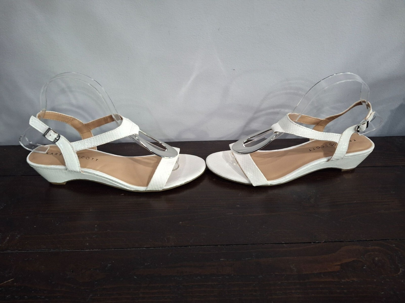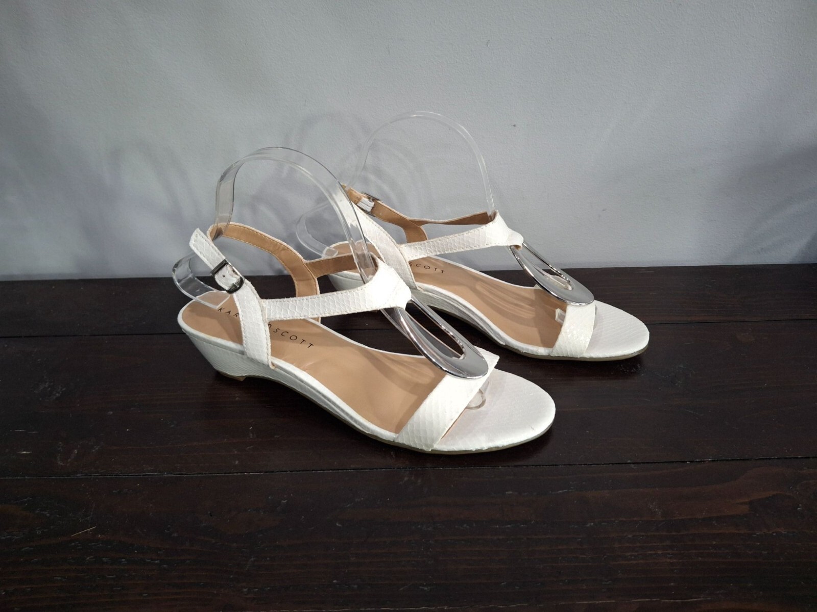 NWT Size 9M Karen Scott's Carmeyy wedge sandals bring a unique ring detail and sleek styling to your look for sophisticated style any time of day. Product Features Open-toe strappy wedge sandals Ankle buckle closure at back strap; ring detail 1-1/2" heel Created for Macy's Manmade upper; manmade sole