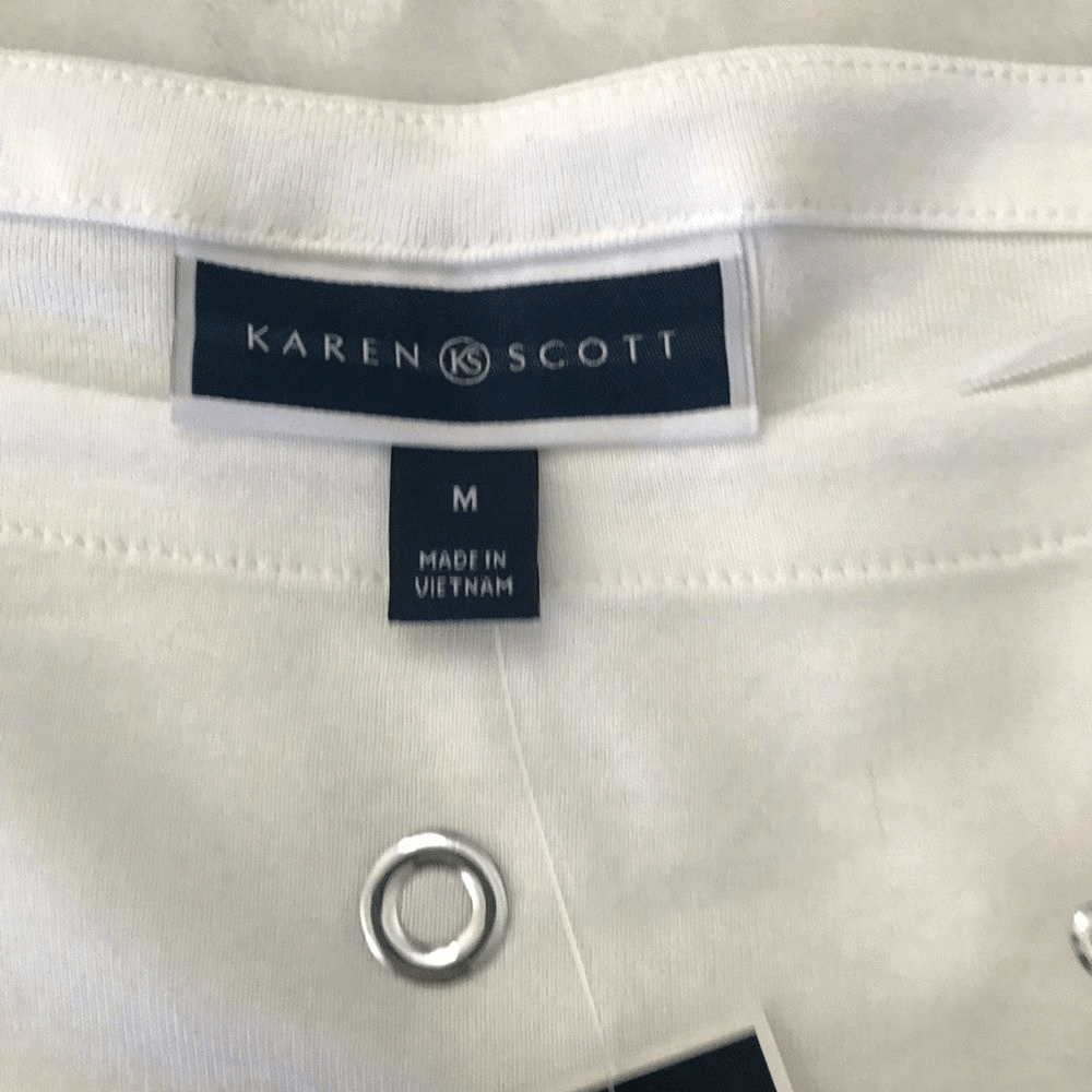 Karen Scott Women’s M 3/4 sleeve Grommet Studded Top Bright White Elevated Basic Size medium- see photos for measurements New with tags Ships fast! Ships from a smoke free home