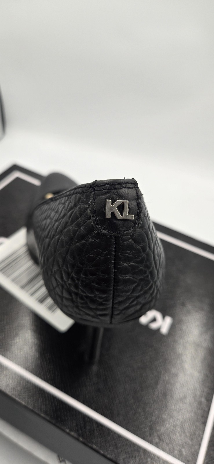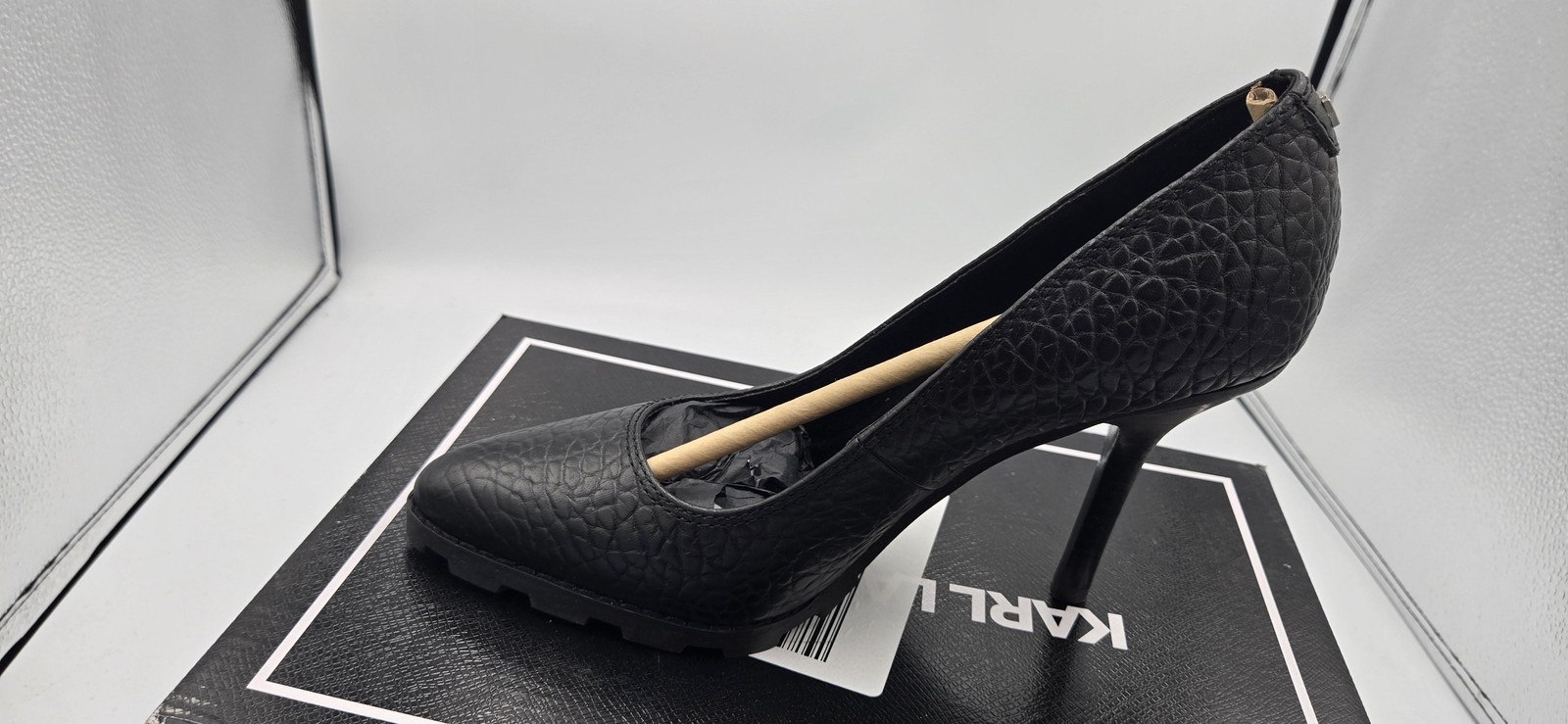 Brand: Karl Lagerfeld Paris Style: Madelyn High Pump slip-on stiletto heel shoes with a sleek, modern silhouette. Size: Womens US 6.5 M, EU 37 (per box). Color: Black eco tumbled leather upper with a pebbled texture and matching black heel. Details: Almond toe, high stiletto heel, lugged non-slip outsole with Karl script logo, cushioned insole with Karl Lagerfeld branding, and metal KL logo hardware at the back heel. Materials: Eco tumbled leather upper (per box label) with durable lugged outsole. Packaging and identifiers: Comes with original Karl Lagerfeld Paris box. UPC: 194775130076. Additional box sticker code labeled UPC: 0000194775130076. Other box codes include style name Madelyn High Pump, ID F977135, and BOL 16590835.