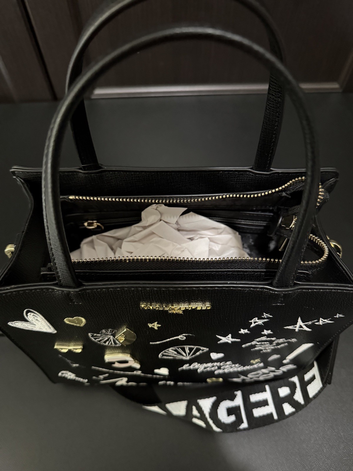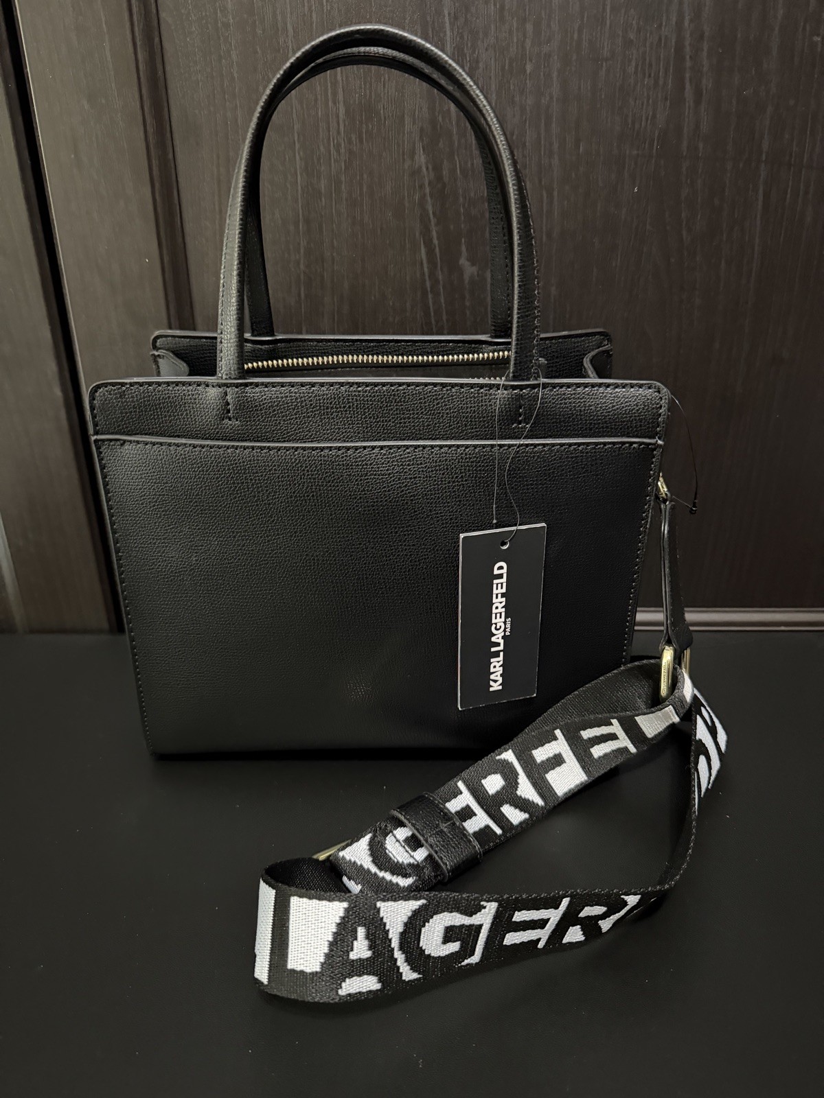 Karl Lagerfeld Maybelle Black Zip Satchel Crossbody Bag with Pins Brand: Karl Lagerfeld Color: Black Condition: Brand New with Tags Material: 100% PVC MRSP: $228 Approximate Dimensions: 8.5" W x 10" H x 3.5" D inches Chic and playful, make a statement with the Maybelle Satchel Bag by Karl Lagerfeld Paris. Features: • Top zipper closure • Gold-tone hardware • 1 exterior pocket • 2 interior pockets • Detachable & Adjustable shoulder strap • 14-23" adjustable strap