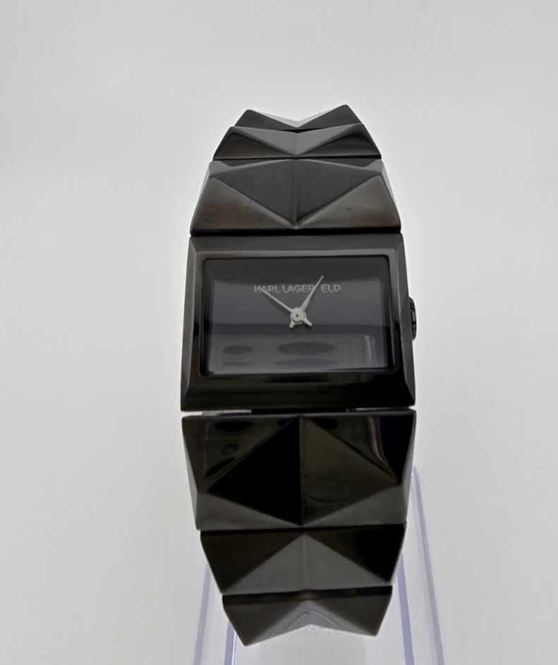 Karl Lagerfeld Perspektive Black Dial Stainless Steel Women's Watch - kl2601 New with Gift Box and Tags! This watch is a Shelf Pull from one of the Major Department Stores. May find few micro scratches on the watch case/band, visible under a direct and strong light. The **Karl Lagerfeld Perspektive Black Dial Stainless Steel Women's Watch - KL2601** delivers sleek, modern elegance in a bold rectangular design. Measuring 27 mm across and 9 mm thick, its black stainless steel case and matching bracelet create a monochromatic, fashion-forward look. The black dial maintains a minimalist aesthetic, protected by a shatter-resistant mineral crystal, while the black steel bezel seamlessly integrates with the case for a cohesive style. Powered by a precise quartz movement, this timepiece ensures reliable timekeeping with a simple ticking seconds hand. The solid case back, screw-down crown, and 5 ATM water resistance provide durability for daily wear. The design’s clean lines and all-black finish make it an ideal choice for both casual and dress occasions. Secured with a sturdy steel folding clasp, the **KL2601** offers both comfort and security on the wrist. As part of Karl Lagerfeld’s Perspektive series, it embodies the brand’s signature edgy sophistication, making it a statement accessory for the modern woman. Features Model: KL2601 Manufacturer: Karl Lagerfeld Series: Perspektive Measurements: 27.00 mm, rectangular Thickness: 9.00 mm Case: Black steel Back case rear: Solid Bracelet: Black steel Dial: Black Buckle: Folding clasp made of steel Glass: Mineral, shatter-resistant Bezel: Steel, black Movement type: Quartz (battery powered) Seconds hand: Ticking Water protection: 5 ATM Other: Screw down crown Fast and Free Shipping You're already purchasing the item. Why pay additional for shipping, especially slow shipping? We get your order shipped out within 1-business day and delivered to your doorstep as quickly as possible. Competitive Pricing With our dynamic pricing model, our prices are always competitive. Our prices are some of the lowest that you will find on the internet. Rest assured that you're getting a good deal when purchasing with us. 30-day Money Back Guarantee We are committed to making sure that you leave this transaction satisfied. If you're unhappy with the product for any reason, you may return it back for your money-back or a replacement within 30 days. No questions asked!