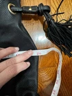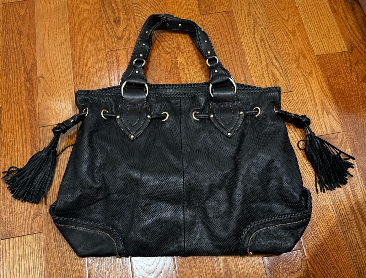 The Kate Landry Black Leather Tote Bag is a stylish and sophisticated choice for women looking for a high-quality handbag. The gold tone hardware and tassel accents add a touch of elegance to the classic black leather exterior. The gold lining color complements the gold handle/strap color, creating a cohesive and luxurious look. Perfect for everyday use or special occasions, this tote bag is a versatile and fashionable accessory for any wardrobe.