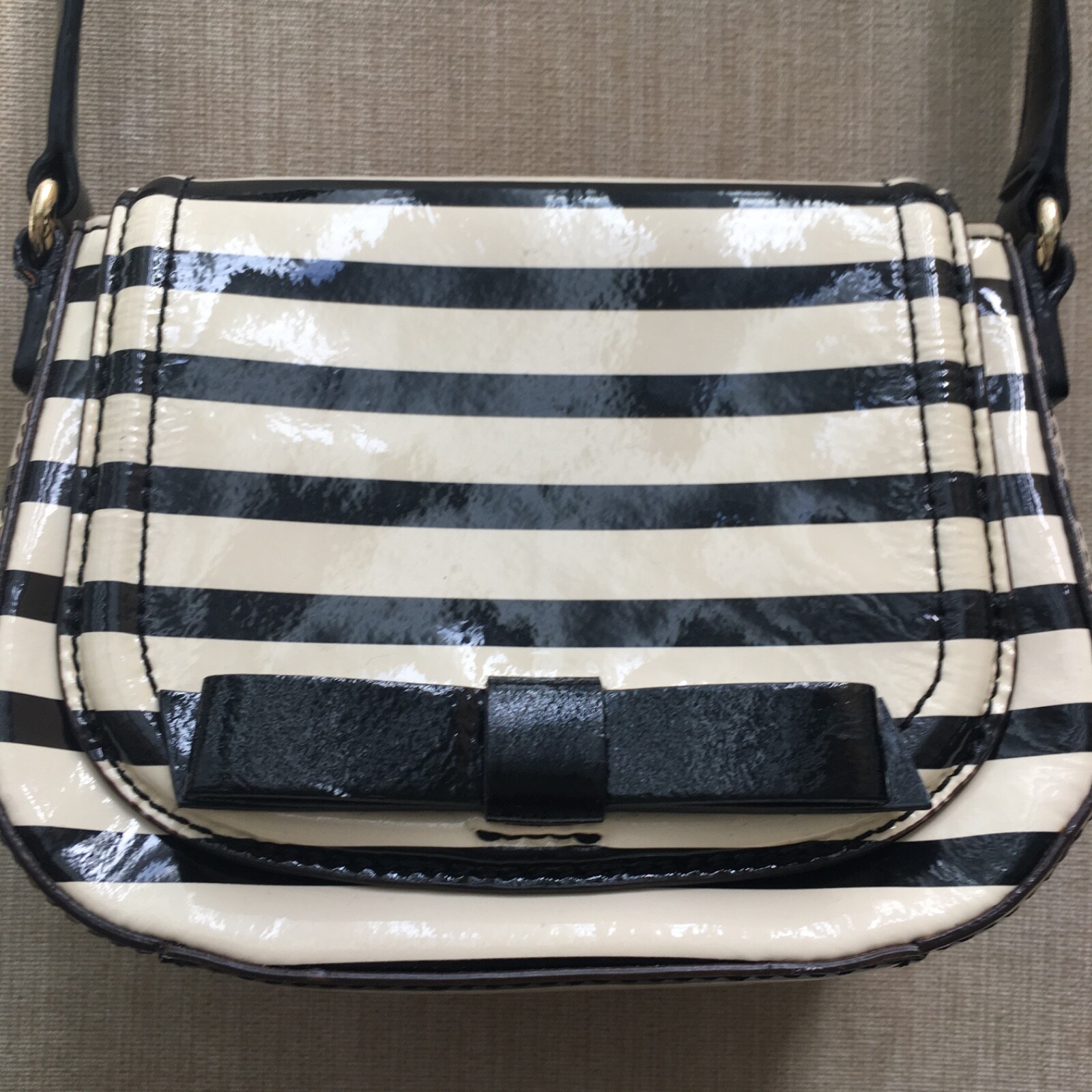 Kate Spade New York Chelsea Park Patent Stripe Crossbody Bag Black/Cream Pre-Owned Condition: Very Good - See pics to confirm. Small mark new metal logo plate on the back.. Likely can be removed.
