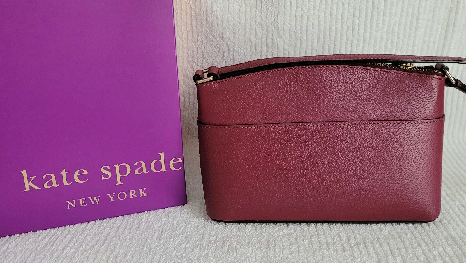 Kate Spade Burgundy Leather Crossbody. Excellent pre-owned crossbody with one outer slip pocket, zip top closure, inner slip pocket and adjustable strap (strap drop = 22 inches at the longest position). Leather logo plate. There are two very small imperfections, one on the back of the bag and one on the front at the bottom, please see the last two pictures. Comes from a smoke free home. Shipped with USPS Mail.