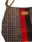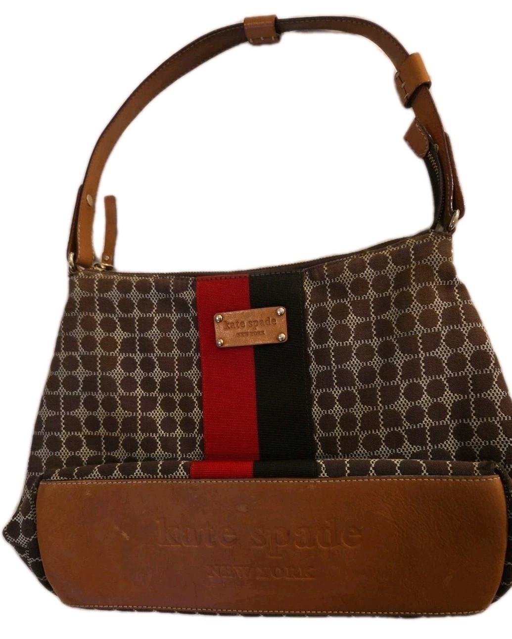 This Kate Spade Classic Dot Noel Red/Brown Striped with Leather Strap & Bottom Shoulder Bag is a stylish and spacious accessory for women. Featuring a rectangular shape with a brown leather strap, this large shoulder bag is perfect for travel, casual outings, & business meetings. The exterior is crafted from canvas with a matte finish and silver hardware accents, while the interior includes inner pockets for organization. The classic polka dot pattern, red lining, and designer theme make this bag a timeless and versatile addition to any wardrobe. Please message me with any other questions thank you