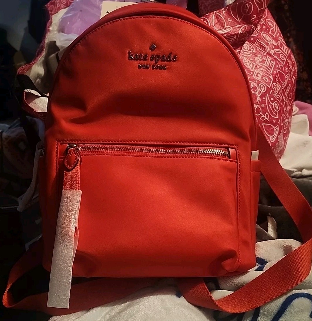 📌BRAND NEW WITH TAGS..GORGEOUS ❤️❤️❤️ This Kate Spade Chelsea Medium Backpack is a stylish and practical accessory for any woman. With a rectangular shape and a zip closure, it's perfect for casual occasions. The backpack features a red nylon and leather exterior, with gold hardware accents and a logo accent. The backpack has a medium size, with a bag width of 10 inches, a bag height of 12 inches, and a bag depth of 5.5 inches. It has a top handle with a drop of 3 inches and an adjustable strap. The interior is lined with fabric and has inner pockets, outer pockets, and a lightweight design. This backpack is part of the Kate Spade product line and is brand new with tags.