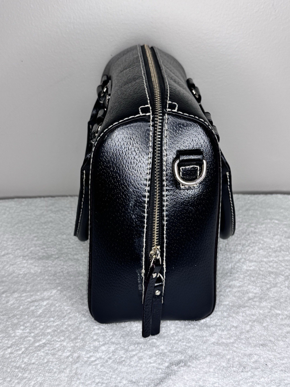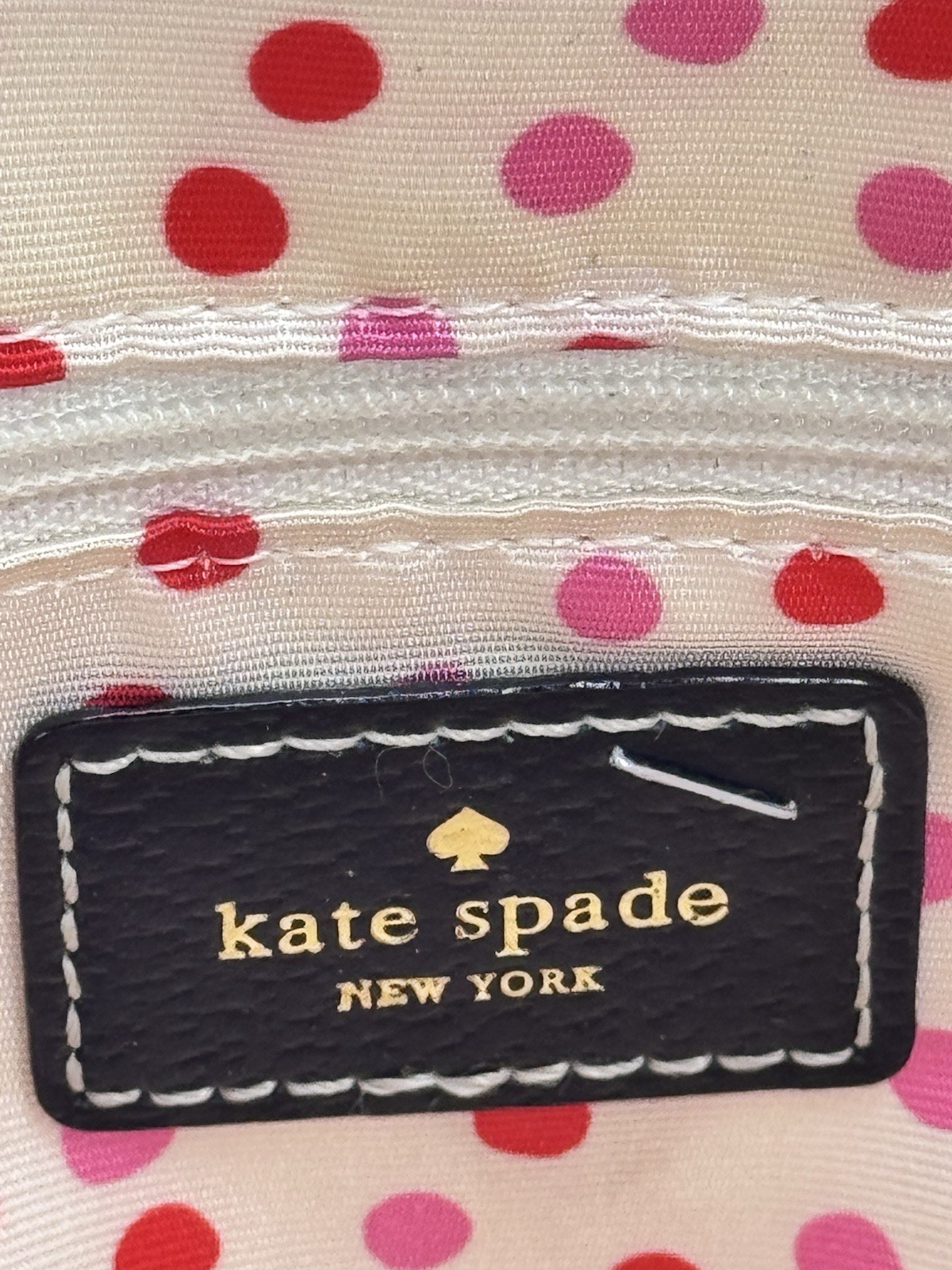 Classic Kate Spade New York black pebbled leather satchel with silver hardware and a structured silhouette. Durable, stylish, and perfect for everyday use. Condition: • Exterior: Excellent — clean leather, no major scuffs, no tears • Hardware: Shiny and functional • Interior: Visible staining on lining (see photos) • Zipper works perfectly Details: • Brand: Kate Spade New York • Color: Black • Material: Pebbled Leather • Style: Satchel / Top Handle • Polka dot interior lining • Structured base with metal feet • Zip top closure Ships fast and packed securely.