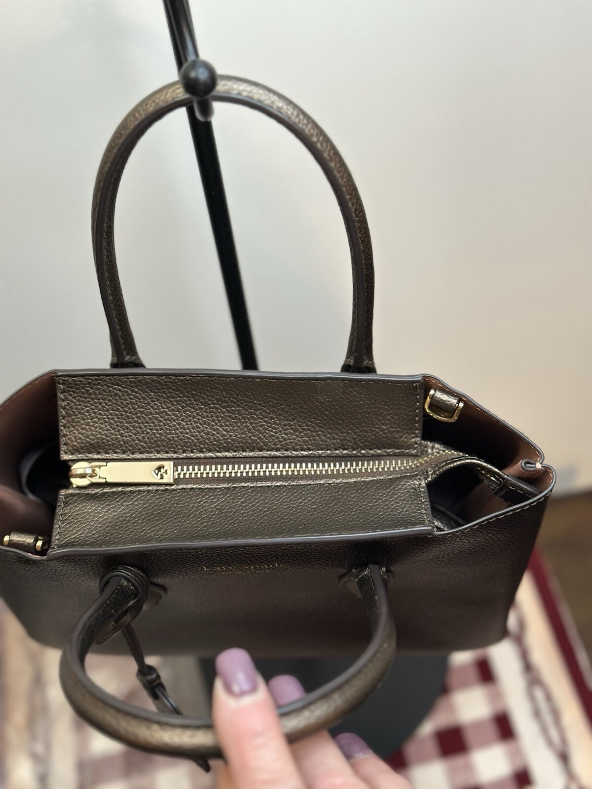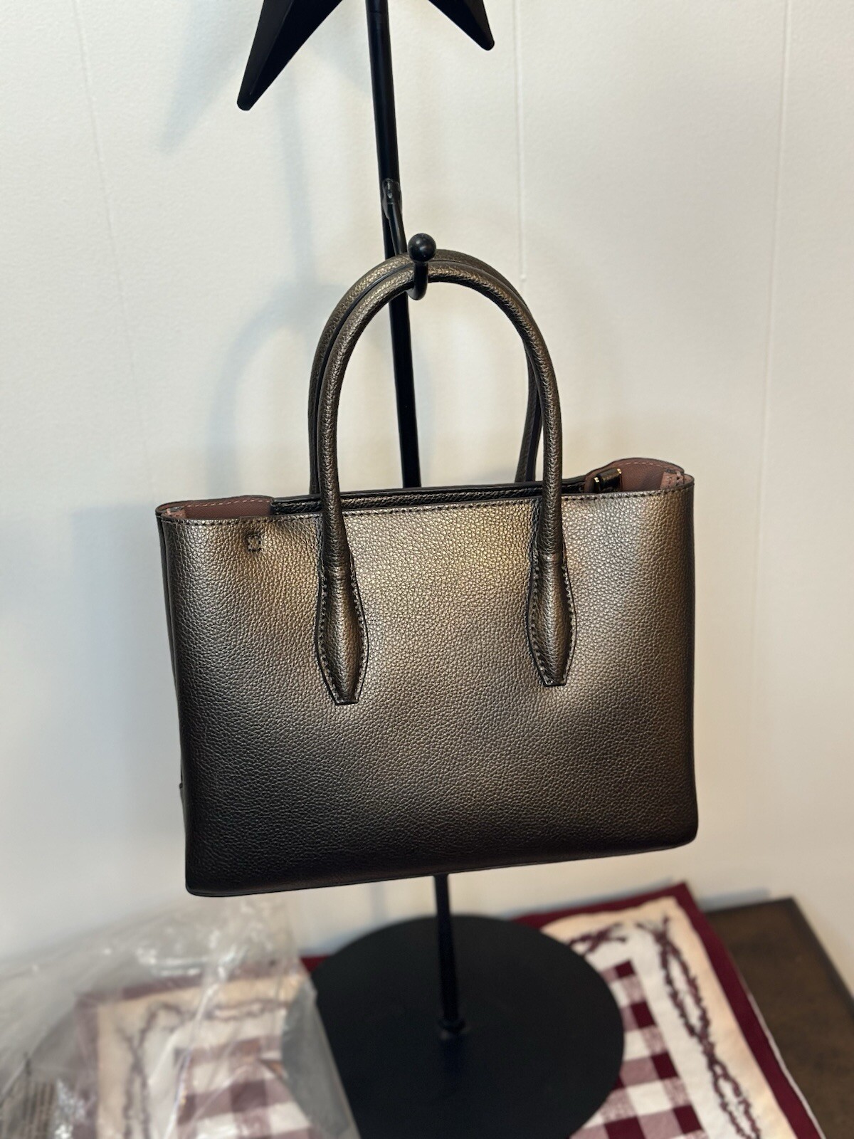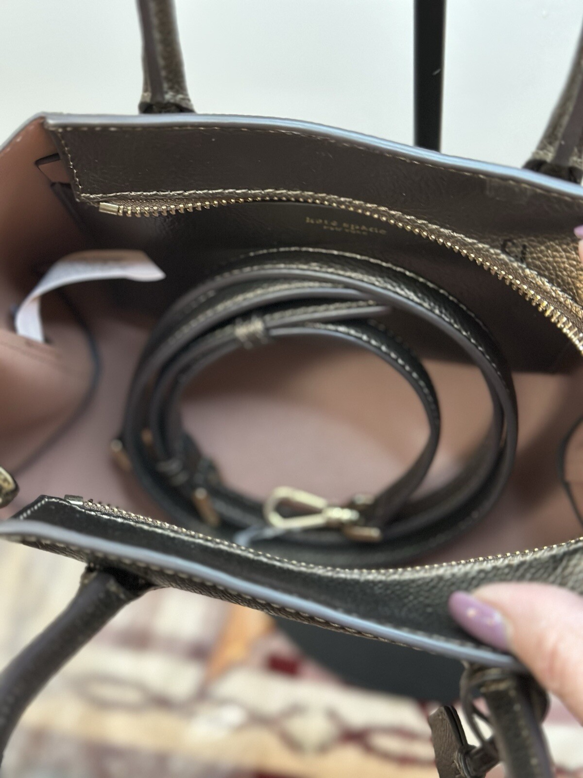 Crafted with precision, the KATE SPADE New York Eva Small Top Zip Cross body Bag is a testament to sophisticated style and functionality. In a chic Ash Metallic finish, this compact leather satchel boasts a sleek design that's perfect for any occasion, whether you're running errands or enjoying an evening out. The bag features a secure zip closure, ensuring your valuables stay safe while on the move.Measuring at a practical 7 1/2 inches in height, 10 inches in length, and a depth of 4 inches, this bag is ideal for carrying your essentials without the bulk. The metallic theme and Ash hue add a touch of elegance to the bag's appearance, while the durable exterior ensures longevity. With its adjustable strap and spacious interior, the Eva model is a stylish and practical choice for the modern woman. sales tag is for retail not included with purchase