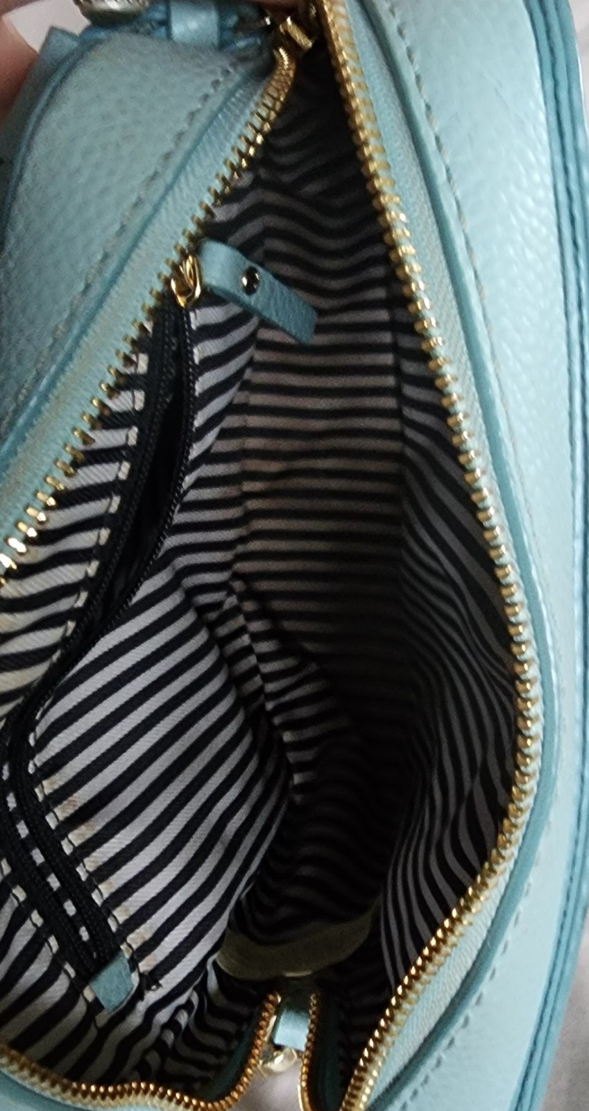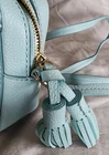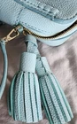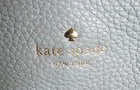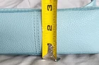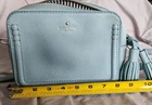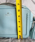 This is a small Kate Spade New York shoulder bag in a mint green color with a blue leather handle/strap. The exterior is made of leather with a fabric lining in black and white. The bag features a solid pattern and is designed for women. With a stylish and trendy design, this shoulder bag is perfect for everyday use and adds a pop of color to any outfit. Made in Japan as part of the Kate Spade product line, this bag exudes quality and sophistication.