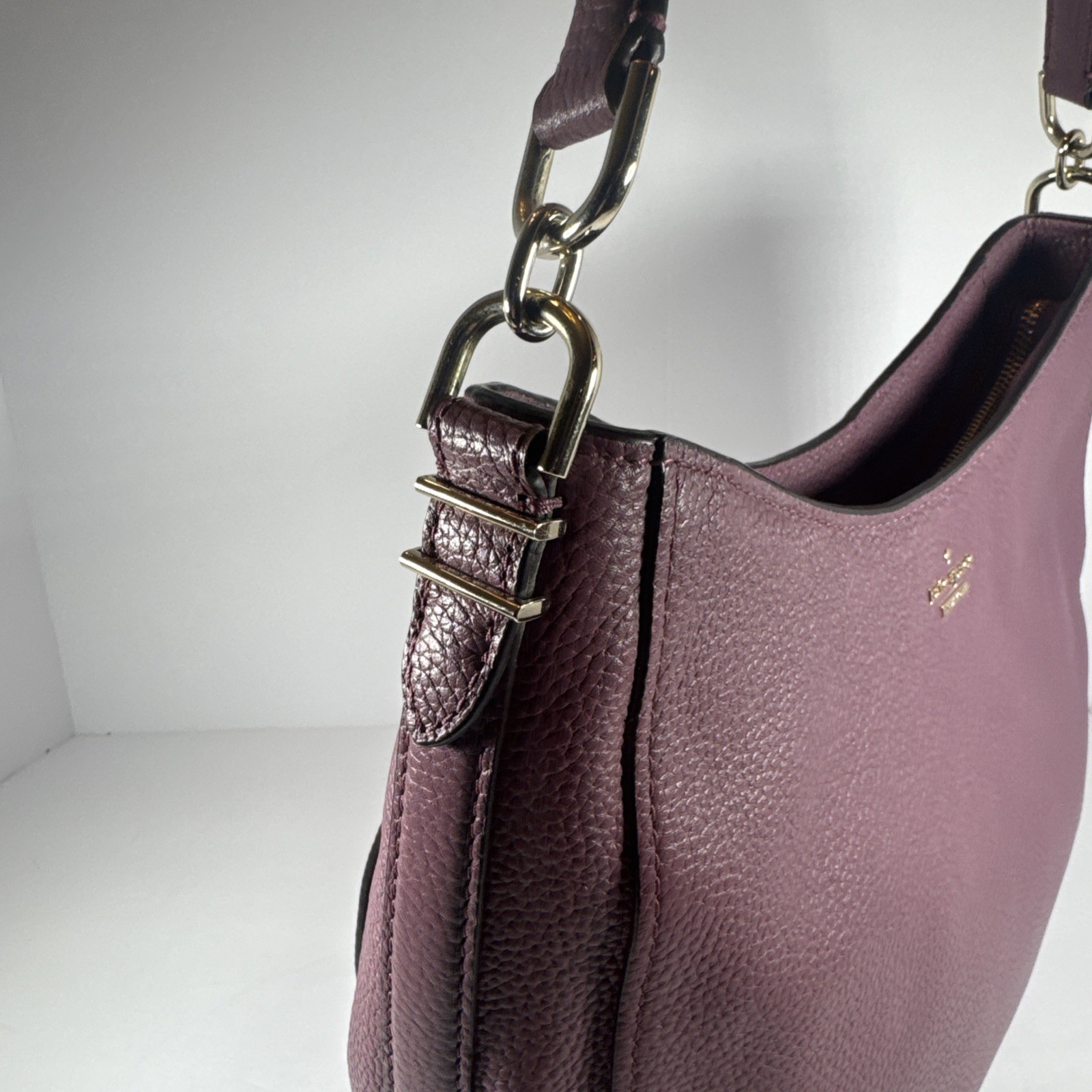 The Kate Spade Oakwood Street Pebbled Deep Violet Purple Leather Shoulder Bag is a stylish and versatile hobo bag perfect for women on the go. Made with pebbled leather in a rich violet purple color, this medium-sized bag features a crescent shape with a silver hardware accent and a purple shoulder strap. It includes inner pockets for organization and is part of the Oakwood Street collection by Kate Spade New York. This hobo bag is both practical and chic, making it a standout accessory for any outfit.