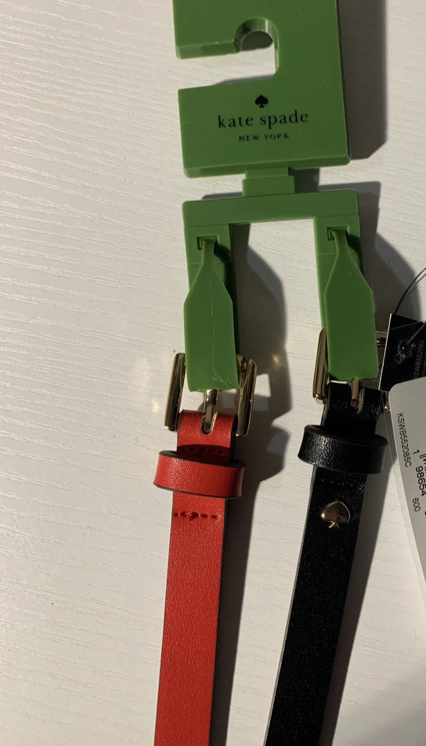 The Kate Spade Red Bow Belt and Black straight Belt Set is a stylish accessory for women SIZE: XL Made of leather, the skinny belts feature a solid red and black color scheme, with an adjustable design and bow accents. Perfect for adding a touch of fashion to any outfit, these belts are from the renowned brand Kate Spade New York and are sure to make a statement with their logo theme.
