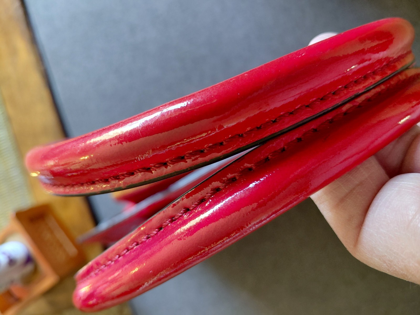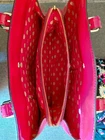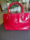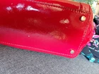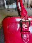 Kate Spade red patent leather shoulder bag with elegant buckle details. Perfect for adding flair to any outfit. There are 3 callouts. Stain on the inside mark on side and cracking on the inside of one of the straps that buckle. (see pics)