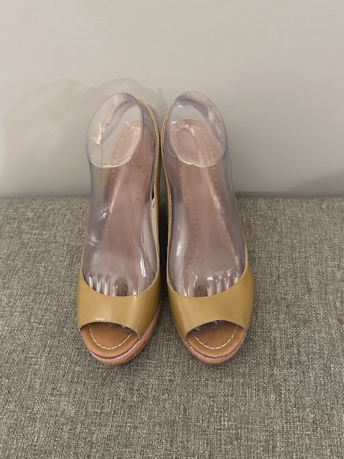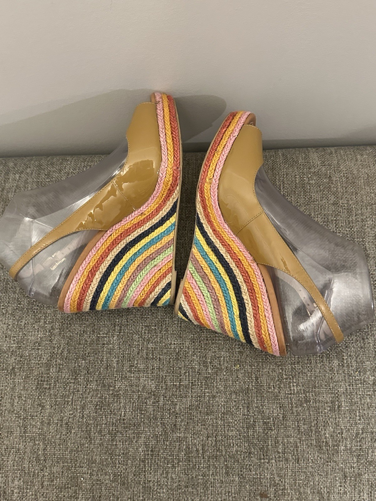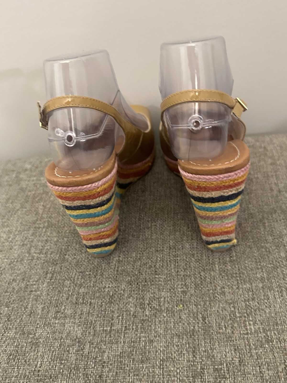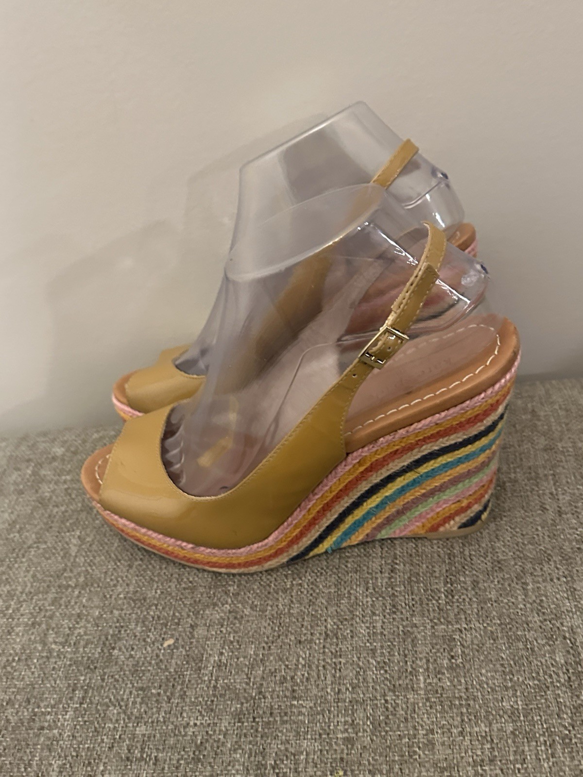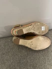These Kate Spade Women's Tan Leather Wedge Peeptoe Sandals in size 8.5 are a stylish and chic choice for any woman. The striped pattern, adjustable buckle closure, and high wedge heel add a touch of sophistication. The brown color and logo accents give these sandals a fun and playful character, perfect for adding a pop of color to any outfit. Made of leather with a M width, these sandals offer both comfort and durability, making them a great addition to any shoe collection. Preowned Good Condition