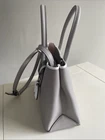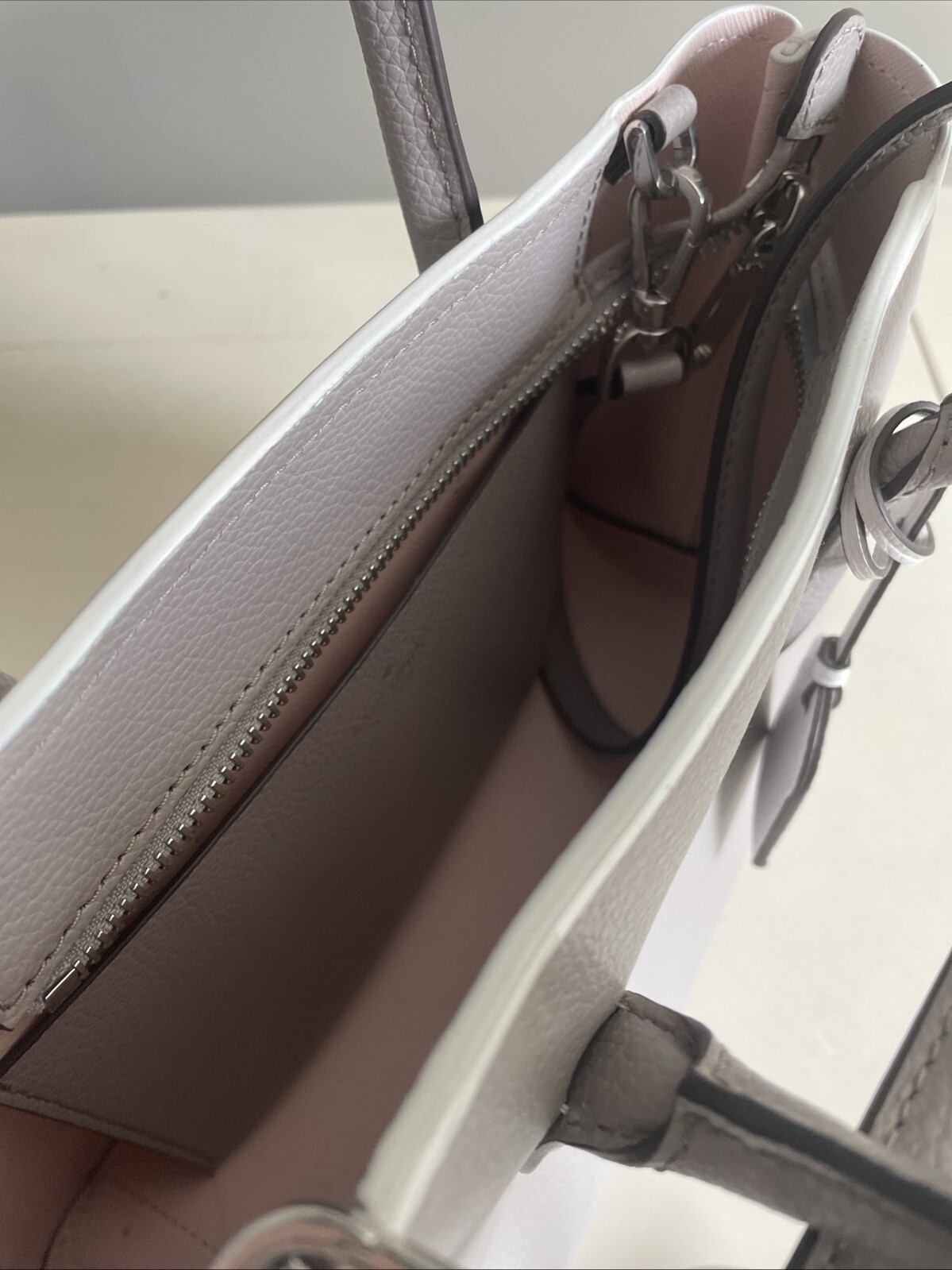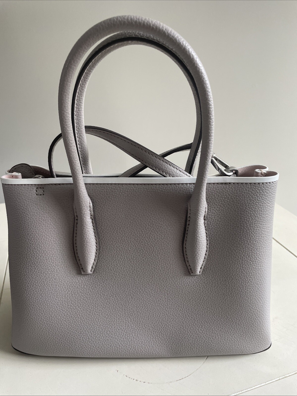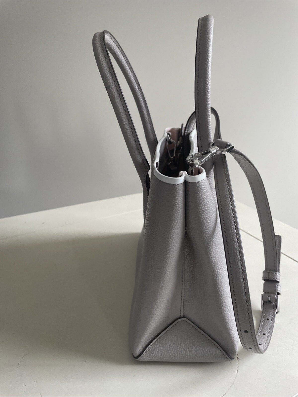 This is a medium-sized kate spade shoulder bag in a silver-tone color. It features a solid leather exterior with silver hardware, a zip closure, and a pink fabric lining. The bag has silver handles/straps made of leather, making it a stylish and elegant accessory for women.