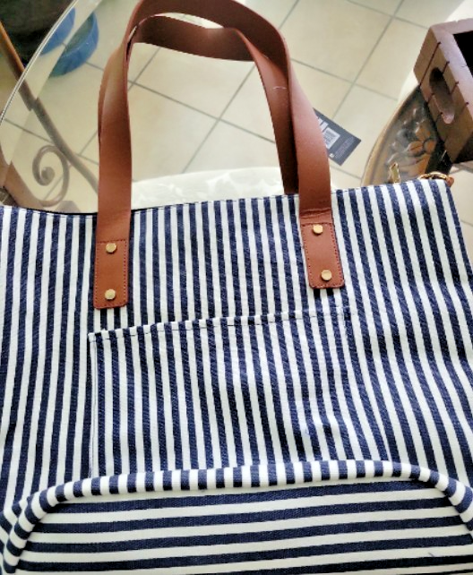 The Kathy Ireland Canvas Tote Bag in Navy White Striped is a stylish and practical choice for women who love a preppy and nautical look. This large tote bag features a zip top closure, brown handles, and gold hardware accents, making it perfect for casual occasions and beach outings. The striped pattern adds a fun and beachy touch to the navy exterior color, while the interior includes inner pockets and an adjustable strap for added convenience. This tote bag by Kathy Ireland is a versatile and fashionable accessory for any wardrobe. We combine shipping on multiple listings purchased, so please visit our store for more great deals! Cyber Store Central | eBay Stores