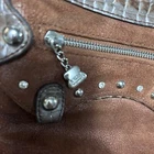 This is a Kathy Van Zeeland brown faux suede shoulder/crossbody purse with a stud and rhinestone accent. The bag has a vertical rectangular shape with a zip closure and brown crossbody strap. It features metal hardware, a fabric lining in gold, and a detachable strap. The exterior is in Arizona Brown with zipper accents, making it a stylish and versatile accessory for casual occasions.