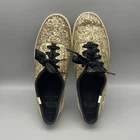 Keds x Kate Spade Shoes Womens Size 7.5 Gold Glitter Ribbon Lace Canvas Sneakers Lightly worn with minor outsole wear and a few small dark marks on soles. Slight scuffing on midsoles and minimal glitter loss from normal use; laces and eyelets intact. No box or extras included. Brand: Keds x kate spade new york Item: Womens low-top casual shoes with glitter-coated upper and satin ribbon laces in a classic Keds silhouette. Color: Gold glitter with black trim and laces Size on tag: US 7.5 | UK 5.0 | EUR 38.0 Style/Model code: WF49738; additional code: H16-61444 Branding: Keds heel badges, kate spade spade logo hardware at back heel, kate spade new york insole print. Details: Lace-up closure with satin ribbon laces, round toe, rubber outsole, low-profile design; great for casual wear and party outfits. Special notes: Box not included unless shown. 529