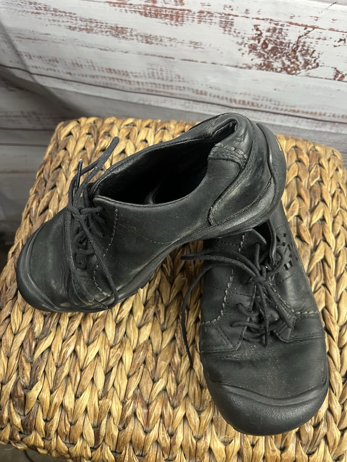 Take your outdoor adventures to the next level with the Keen Reisen Women's Lace-Up Shoes. Designed to deliver both style and comfort, these size 6 athletic sneakers are ideal for walking trails or casual city strolls. The sleek black leather upper material pairs with a durable rubber outsole to withstand varied terrains, while the fabric lining ensures a comfortable fit for all-day wear. These low-top sneakers feature a standard shoe width and foam insole for additional support, making them suitable for any season. The lace-up closure ensures a secure fit, whether you're navigating rocky paths or urban jungles. The Reisen model, with its solid pattern and non-customized design, offers a reliable choice for those who value functionality and a touch of style in their footwear.