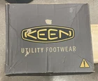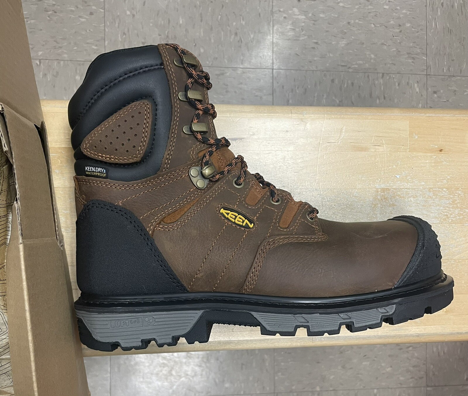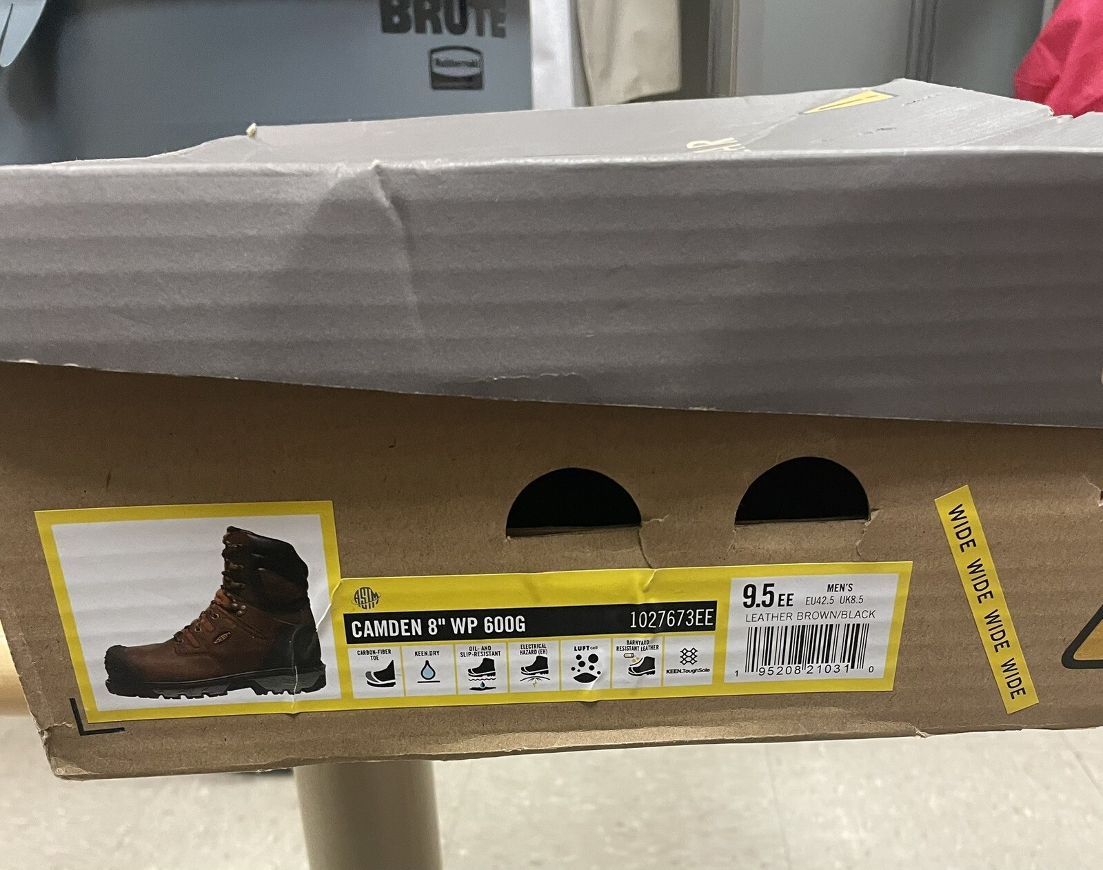 The product is a Keen Utility Camden boot for men in size 9.5. It features a brown and black color combination, with a waterproof composite toe design. The outsole is made of leather, and the shoe width is EE, indicating a wide fit. Ideal for work environments, these 8-inch leather boots offer both style and functionality.