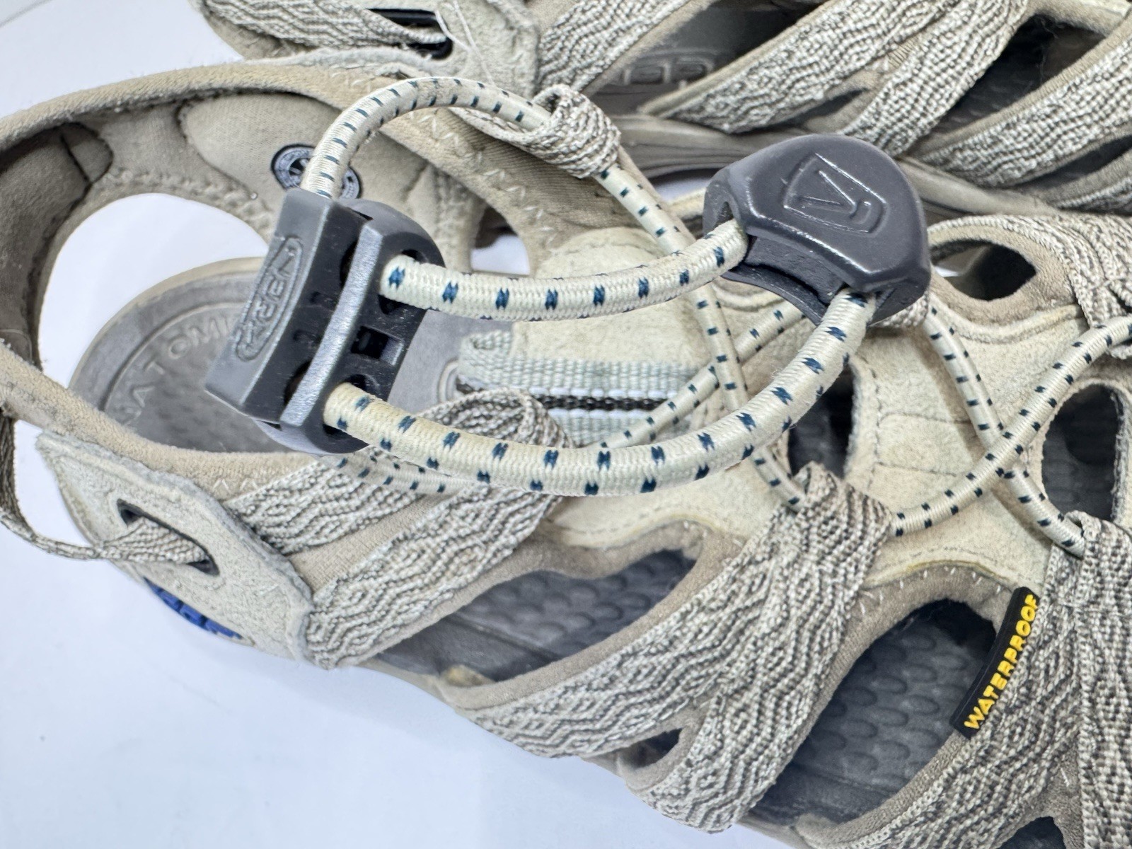The Keen Women's Whisper Fisherman Sport Sandal in size 9 is a versatile and comfortable option for outdoor activities. With a waterproof design, adjustable drawstring closure, and arch support, these sandals are perfect for travel, activewear, and casual occasions. The beige color and logo accents add a stylish touch, while the flat heel and breathable synthetic upper material ensure maximum comfort. Ideal for nature lovers, boating enthusiasts, and sports fans, these Keen Whisper sandals are a practical choice for any season.