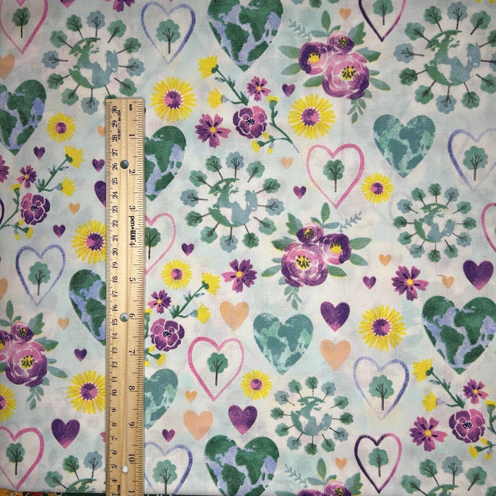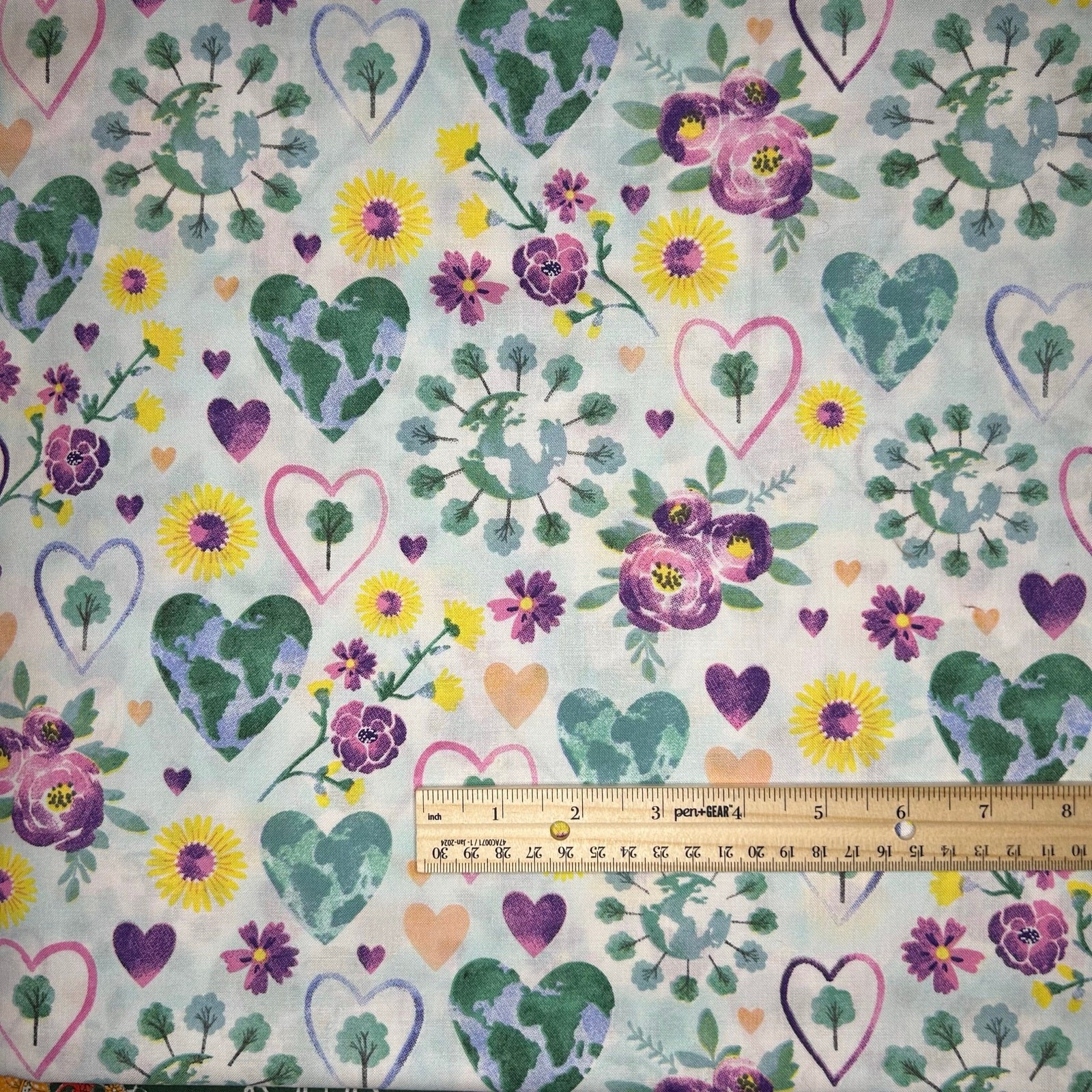 1 yard of fabric - measures 36 inches long x 43 inches wide Keepsake Calico Earth Love Print - white background with heart, flowers and earth print in greens, blues, purples, yellows. 100% Quilt Cotton The fabric was thrifted and comes from a smoke-free & pet friendly environment. Explore my store for additional fabrics, craft supplies and collectibles. Disclaimer: While every attempt has been made to accurately represent the fabric's true color and nature, variations may occur. Open to Offers and Bundles.